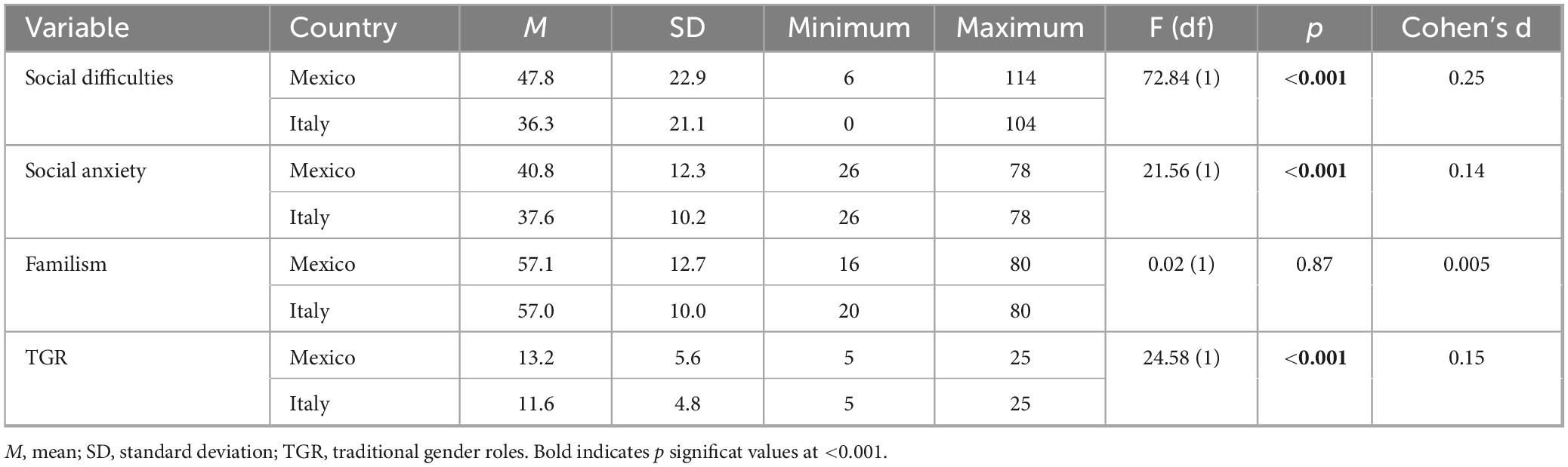 The specific objectives were: (a) to detect possible differences in social difficulties, social anxiety and family cultural values (i.e., familism, TGR) between Mexican and Italian participants,