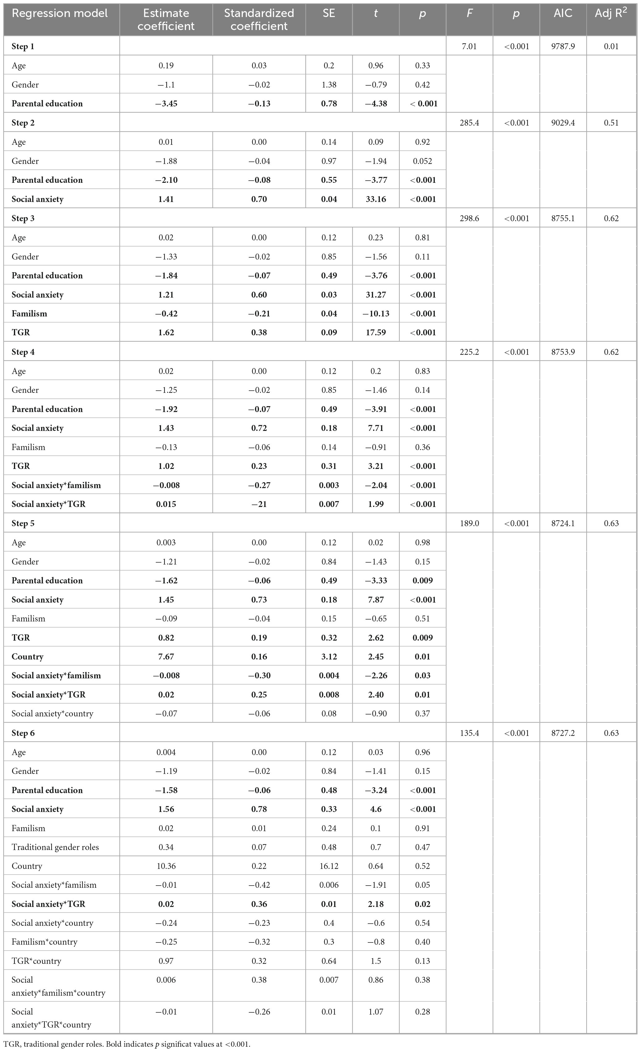 Then, a hierarchical linear regression analysis was conducted with social difficulties as dependent variable. In the first step we included age, sex, and parents’ educational level as covariates; in the second step we added social anxiety; in the third step we added familism and traditional gender roles, then in the fourth step we included the interaction between social anxiety and familism, and the interaction between social anxiety and traditional gender roles. In the fifth step, country was considered as a third moderator to evaluate whether there were any differences in the association between social anxiety and social difficulties in Mexico and Italy. Finally, in the last step, three-way interactions were run to investigate possible group differences in the association between variables (social anxiety*familism*country; social anxiety*TGR*country). This method was adopted because it is the most suitable approach in line with our second and third research objectives, which firstly aim to understand how contextual factors, such as familism and TGR, may moderate the association between social difficulties and social anxiety, and, ultimately, to determine whether familism and TGR might differently moderate this relationship in Mexico and Italy.