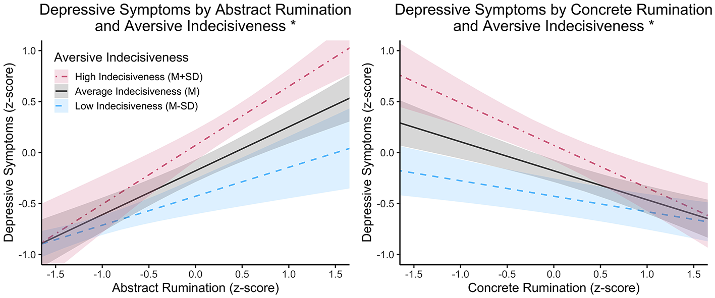 These results suggest that the co-occurrence of abstract rumination and aversive indecisiveness may confer heightened risk for depressive symptoms, highlighting the importance of considering both factors jointly in understanding and treating depression.