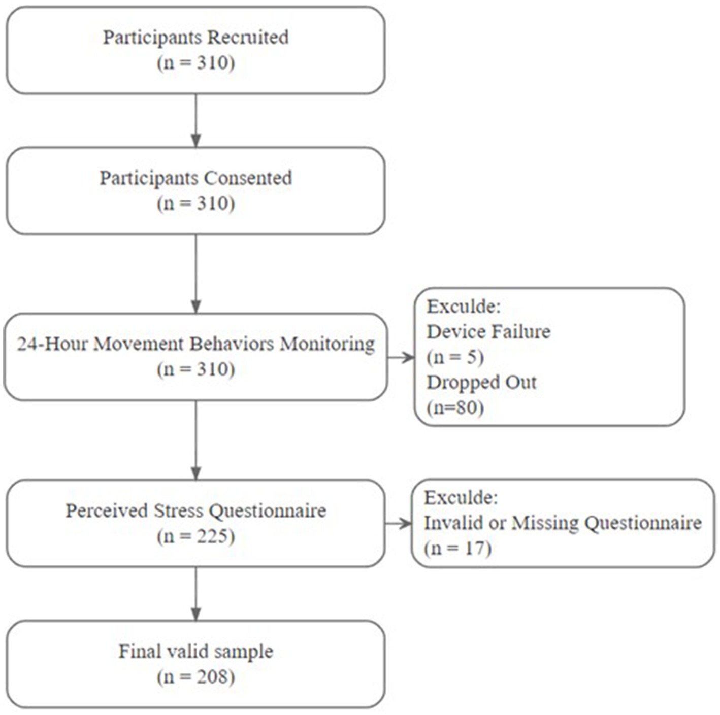 A total of 310 potential participants were initially recruited and provided consent. During the 24-hour movement behaviors monitoring phase, 53 individuals were excluded for failing to complete testing (five due to device failure, 80 dropped out). Subsequently, 225 participants completed the perceived stress questionnaire, but 17 were excluded for invalid or missing data. Ultimately, 208 participants were included in the final analysis (Figure 1). To evaluate whether this sample size affords adequate statistical power, sample size calculations were performed using GPower 3.1. For a multiple linear regression omnibus test (fixed model, R2 deviation from zero) assuming a medium effect size (f2 = 0.15), six predictors (for example: sleep, sedentary time, LPA, MVPA, age, sex), α = 0.05 and power (1 − β) = 0.95, the required sample size is approximately N ≈ 146. The final sample of N = 208 therefore exceeds these thresholds, indicating sufficient power to detect small–to–medium associations between 24-hour movement behaviors and perceived stress under commonly used effect-size assumptions.