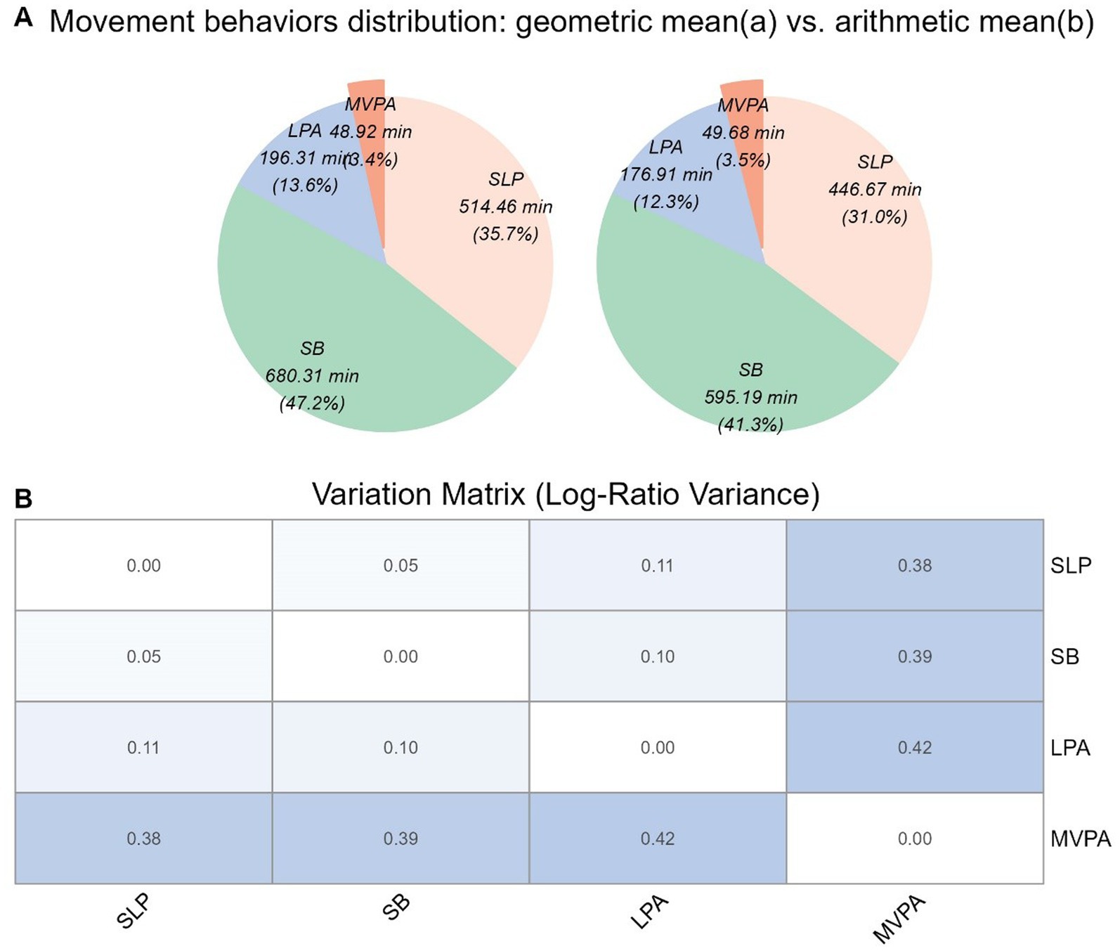 Figure 2. (A) Movement behaviors distribution based on geometric mean (a) and arithmetic mean (b). The pie charts display the proportion of time spent in each behavior: MVPA (moderate-to-vigorous physical activity), LPA (light physical activity), SB (sedentary behavior), and SLP (sleep). (B) Variation matrix of log-ratio variances. This matrix shows the variance between pairs of behaviors, where lower values indicate stronger co-dependence.