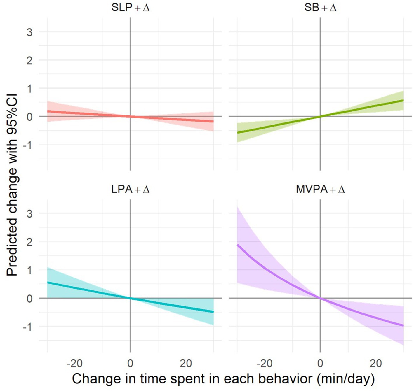 Figure 3. Dose–response relationships of time reallocation between different behaviors. MVPA, moderate-to-vigorous physical activity; LPA, light physical activity, SB, sedentary behavior; SLP, sleep.