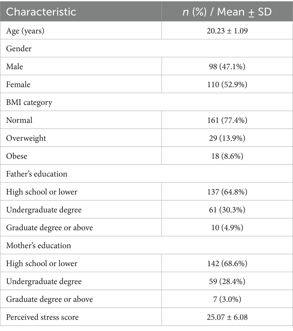 A total of 208 university students were included, with a mean age of 20.23 ± 1.09 years. Gender distribution was nearly balanced, 98 males (47.1%) and 110 females (52.9%). BMI classification showed 161 participants (77.4%) had normal weight, 29 (13.9%) were overweight, and 18 (8.6%) were obese. The mean perceived stress score was 25.07 ± 6.08, indicating a moderate stress level. Participant characteristics are presented in Table 1.