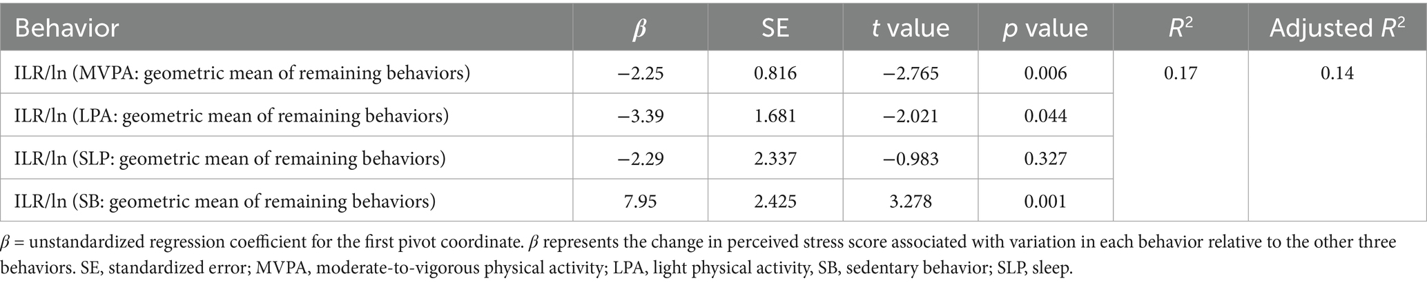 Compositional linear regression analysis revealed distinct associations between daily activity behaviors and perceived stress (Table 2). The overall model explained 17% of the variance in perceived stress (R2 = 0.17, Adjusted R2 = 0.14). Time spent in MVPA was significantly and inversely associated with perceived stress (β = −2.25, SE = 0.816, t = −2.765, p = 0.006), indicating that a greater proportion of MVPA relative to other behaviors was associated with lower stress levels. Similarly, LPA was also inversely related to perceived stress (β = −3.39, SE = 1.681, t = −2.021, p = 0.044). In contrast, SB showed a strong positive association with perceived stress (β = 7.95, SE = 2.425, t = 3.278, p = 0.001), suggesting that a higher proportion of sedentary time was linked to greater perceived stress. Sleep was not significantly associated with perceived stress (β = −2.29, SE = 2.337, t = −0.983, p = 0.327).