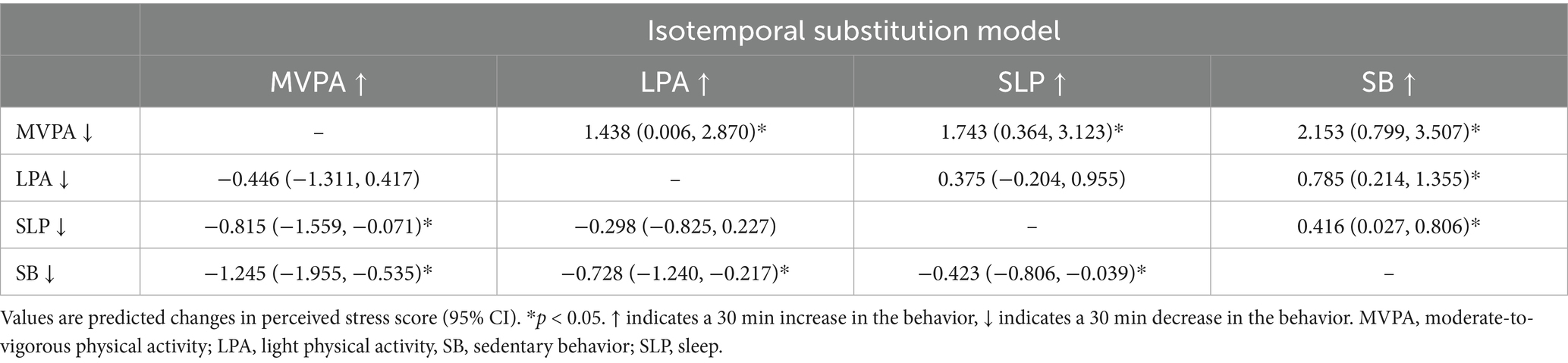 Based on the fitted model, isotemporal substitution analysis predicted changes in perceived stress when time was reallocated among behaviors. Standardized regression coefficients (β) and 95% confidence intervals (CI) were reported.