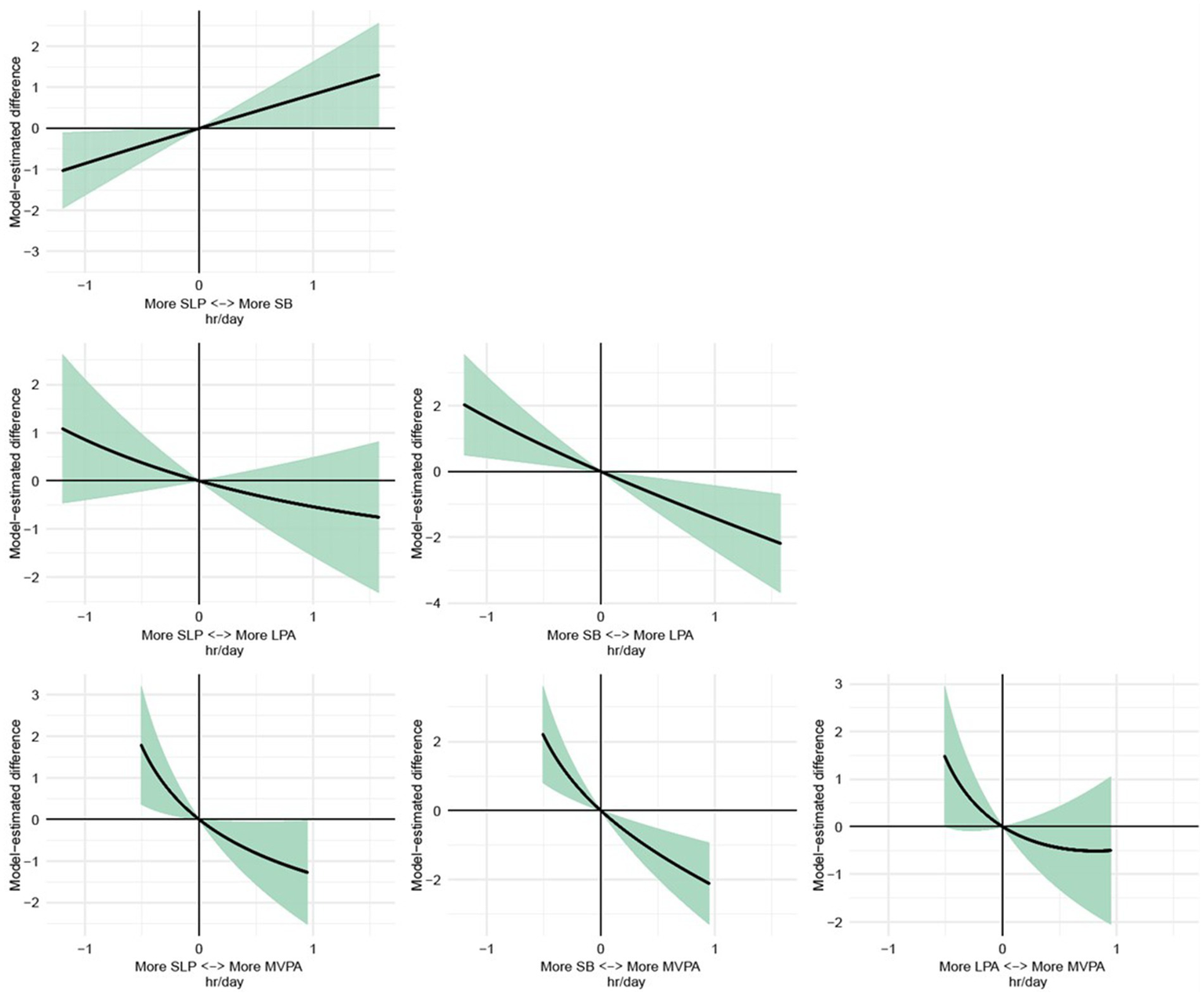 Dose–response relationships of time reallocation between different behaviors. MVPA, moderate-to-vigorous physical activity; LPA, light physical activity, SB, sedentary behavior; SLP, sleep.