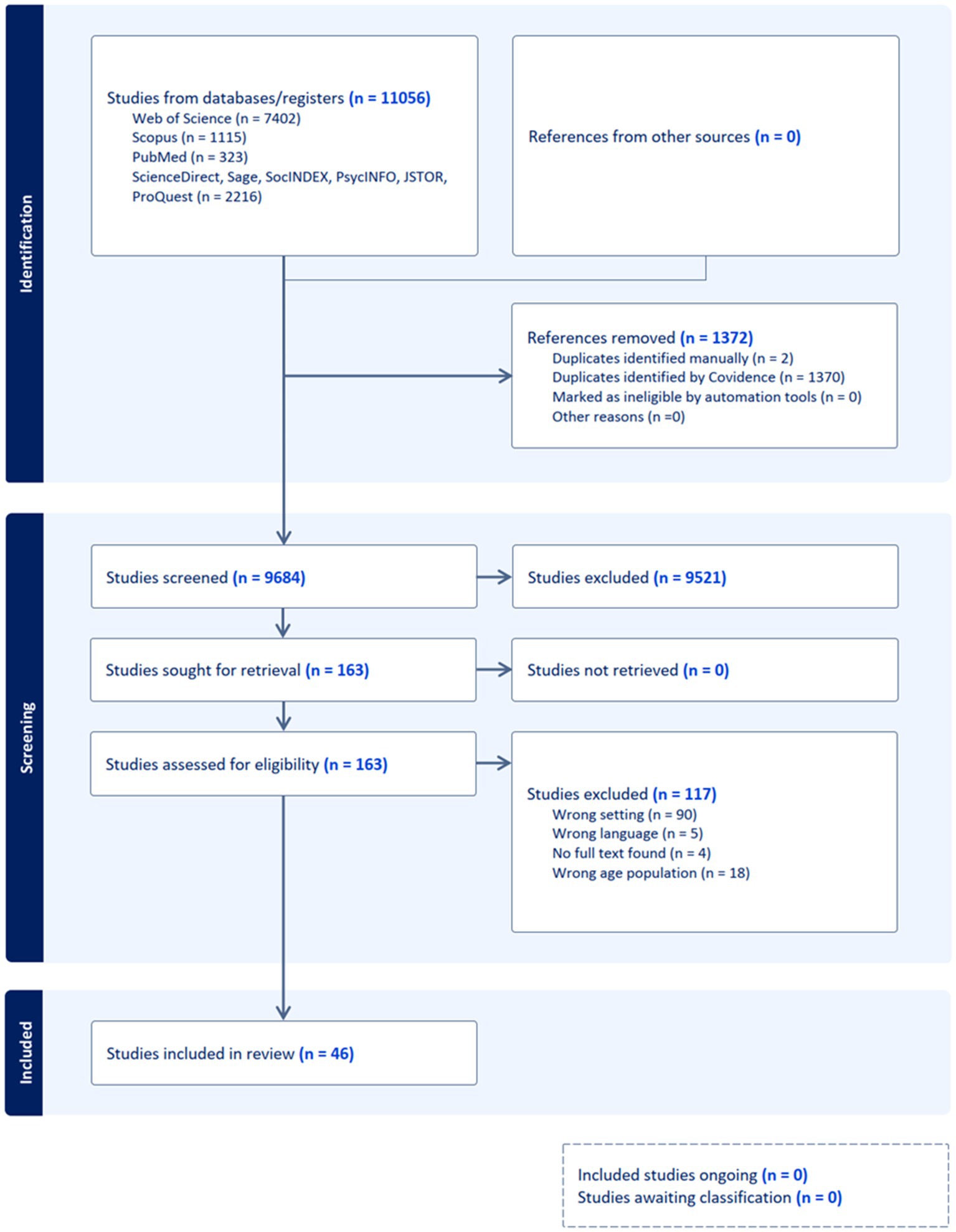 Articles were excluded if they were published in languages other than English, were not peer-reviewed, or did not include participants within the targeted age range. Many excluded records were also non-empirical sources, such as conference proceedings, theses, dissertations, gray literature, or newspaper reports. Once all conditions were satisfied, the articles advanced to the full-text review phase. During this stage, the articles underwent thorough reading to verify compliance with the inclusion and exclusion criteria. During these phases, two authors (Hadi Farahani and Katja Lötjönen) independently conducted the assessments. In cases of disagreement, a third author (Marlen Nissinen) was consulted to reach a consensus. Articles that were selected then advanced to the data extraction phase. The search strategy resulted in 46 studies being included in this scoping review (Figure 1).