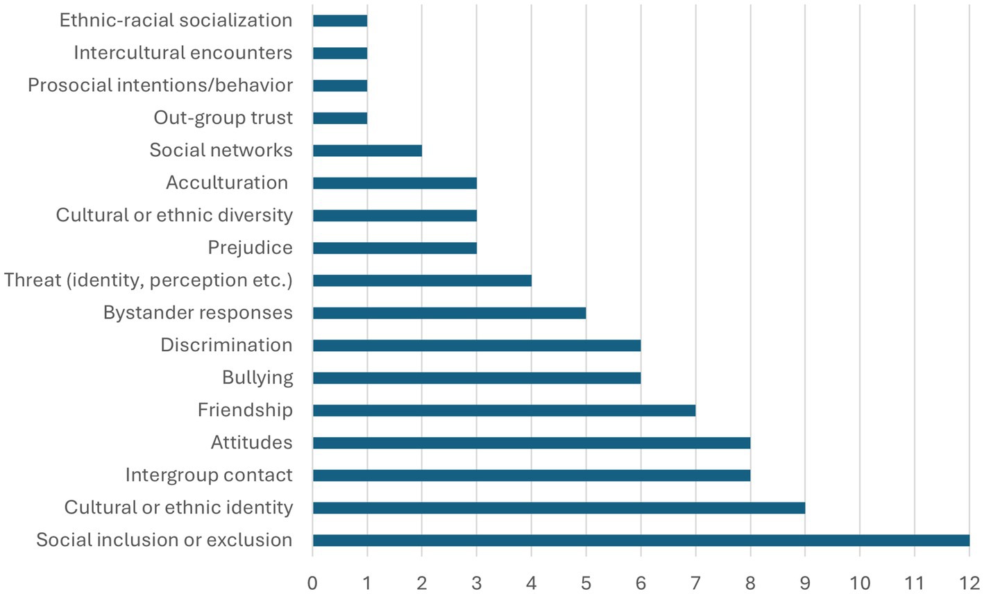 Other theoretical frameworks used in the included studies were social cognitive theory (van Bergen et al., 2017; Chávez et al., 2021; Gönültaş and Mulvey, 2022), acculturation approaches (Munayer and Horenczyk, 2014; Szabó et al., 2020; R’boul et al., 2023), the socio-ecological approach (Priest et al., 2014; Mazzone et al., 2018), social capital theory (Dryden-Peterson, 2010; Rienties and Nolan, 2014), network theories (Rienties and Nolan, 2014; Lintner et al., 2023), and social dominance theory (Wang et al., 2020; Maor and Gross, 2023). Additionally, four studies did not refer to any particular theoretical framework but based their approach on a literature review related to the topic of the study (Banfield and Dovidio, 2013; Korem and Horenczyk, 2015; Kretschmer and Leszczensky, 2022; Gönültaş and Mulvey, 2023b), while the remaining 12 studies drew on various other theoretical frameworks beyond those mentioned above (Brenick et al., 2012; Spiel and Strohmeier, 2012; Çelebi et al., 2014; Hitti and Killen, 2015; van Bergen et al., 2017; Szabó et al., 2020; Aral et al., 2022; Saunders et al., 2022; Carter-Thuillier et al., 2023; Palmer et al., 2023; Piipponen, 2023; Spiegler et al., 2024). The theoretical frameworks employed in the included articles were instrumental in conceptualizing and enhancing the understanding of various cognitive aspects of group-based divisions among individuals from diverse cultural backgrounds. Consequently, approaches that emphasize socio-cognitive processes were predominantly utilized.