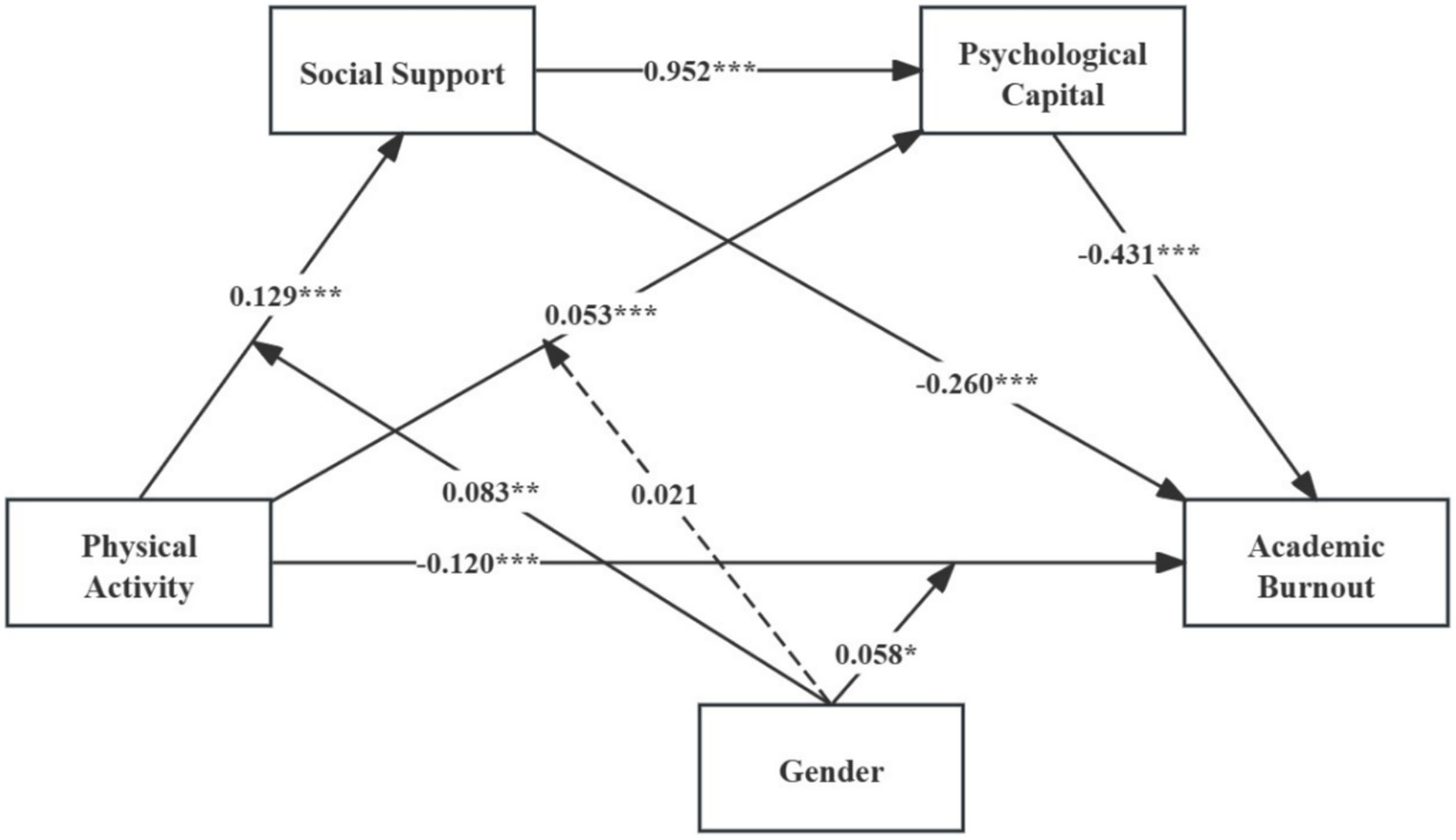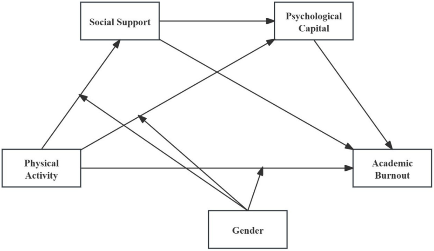 Physical activity (PA), recognized for its affordability and effectiveness in promoting health, has been consistently linked with psychological benefits such as enhanced self-confidence and greater resilience, which in turn are associated with improved learning performance and lower level of AB (Chen et al., 2022). Social support (SS), has been found to provide emotional, informational, and material assistance to students, which may buffer stress and correlate with reduced AB (Fu, 2024; Kim and Lee, 2022). Psychological capital (PsyCap) has also been identified as a predictor of academic engagement, which is in turn related to lower burnout and fatigue (Virga et al., 2020). Nevertheless, these associations appear to vary across sociocultural contexts, physiological characteristics, and behavioral patterns. For example, male and female students often differ in their motivation, type, and frequency of engaging in PA (Espada et al., 2023), suggesting that gender may shape the extent to which PA relates to SS, PsyCap, and AB.