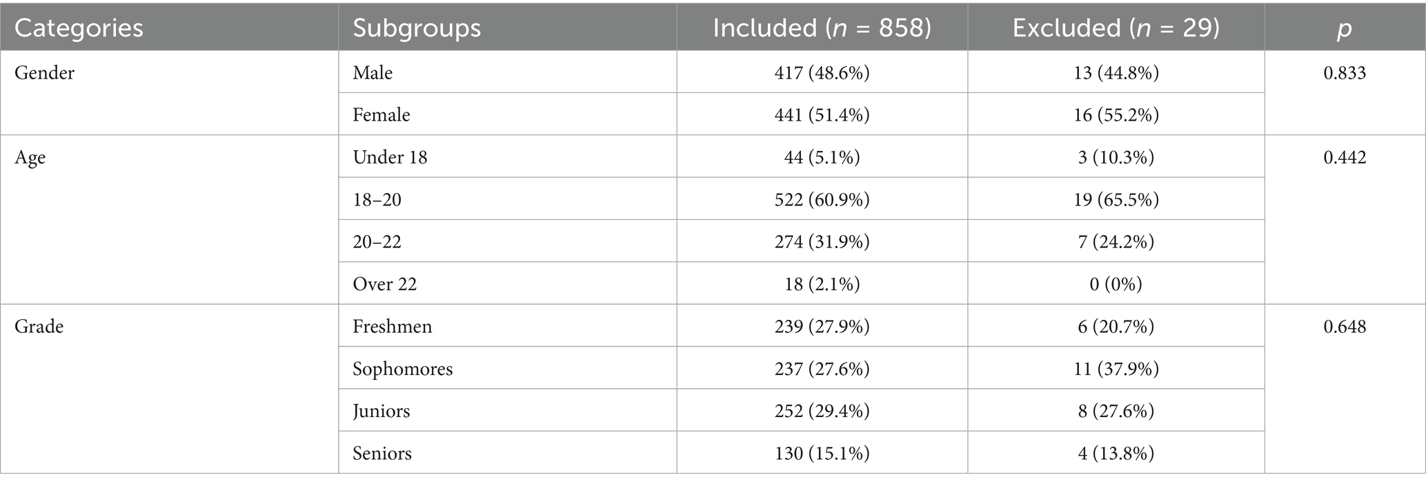 The research team distributed a total of 973 questionnaires and collected 887 responses. After screening and verification, 29 invalid questionnaires were deleted. Specifically, 6 questionnaires were excluded due to incompleteness (answering rate below 80% with too many missing items to allow subsequent statistical analysis), 9 questionnaires were excluded because the response time was either too short or too long (e.g., less than 1 min or more than 30 min), and 14 questionnaires were excluded because the same option was selected for too many items (e.g., more than 80% of items marked as “strongly disagree” or “strongly agree”). In the end, 858 valid questionnaires were retained, yielding a valid response rate of 88.2%. To examine whether these exclusions caused systematic bias, we compared the included and excluded samples on basic demographic characteristics (gender, age, grade). The results showed no significant differences between the two groups (all p > 0.05), indicating that the exclusions did not materially bias the composition of the final sample.
