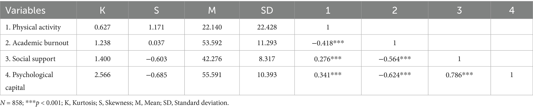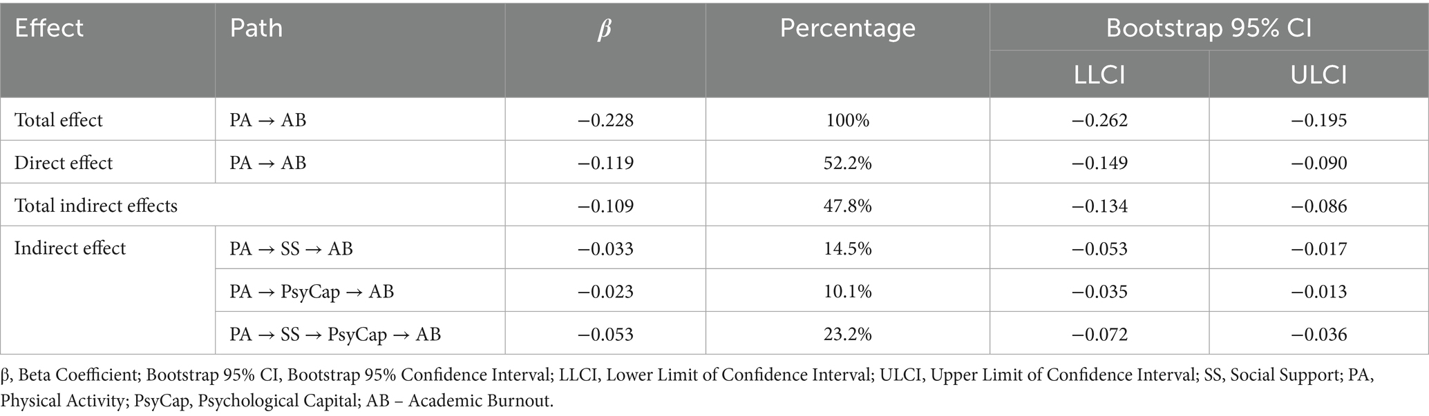 Conclusion: Overall, this study highlights plausible pathways through which physical activity may relate to academic burnout by fostering social support and psychological capital. These findings expand the current understanding of the association between physical activity and academic burnout, and offer valuable implications for educational practice.