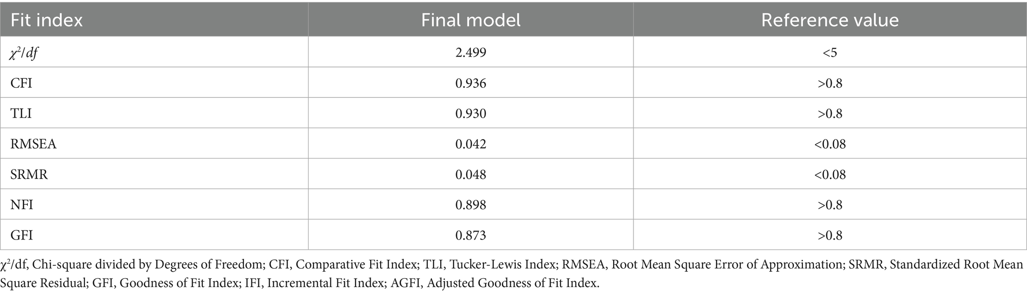 Social support was measured using the Multidimensional Scale of Perceived Social Support (MSPSS) developed by Zimet et al. (1988). The Chinese version of this scale has been validated in previous studies (Chou, 2000) and has demonstrated good reliability and validity among college student populations (Huang and He, 2025). This scale contains 12 items across three dimensions: support from friends (e.g., “My friends really try to help me”), family (e.g., “My family is willing to help me when I need it”), and significant others (e.g., “There is a special person who is around when I am in need”), with four items per dimension. Participants self-rated their perceived support using a 5-point Likert scale, producing a total score ranging from 12 to 60, with higher scores reflecting greater perceived SS. The MSPSS exhibited solid psychometric qualities, demonstrated by Cronbach’s alpha of 0.941, KMO of 0.949, and a significant Bartlett’s sphericity test (p < 0.001). CFA results indicated good model fit: χ2/df = 3.835, RMSEA = 0.058, GFI = 0.970, AGFI = 0.945, IFI = 0.984, CFI = 0.984, and TLI = 0.974.