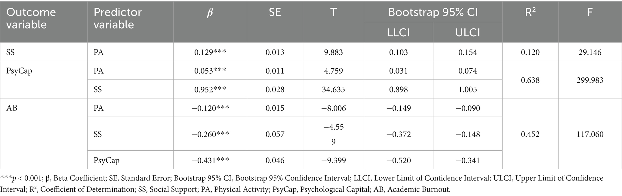 The regression analysis results revealed that PA was significantly positively correlated with SS (β = 0.129, p < 0.001) and PsyCap (β = 0.053, p < 0.001) and significantly negatively correlated with AB (β = −0.120, p < 0.001). Additionally, SS was significantly positively correlated with PsyCap (β = 0.952, p < 0.001) and significantly negatively correlated with AB (β = −0.260, p < 0.001). Furthermore, PsyCap was significantly negatively correlated with AB (β = −0.431, p < 0.001).