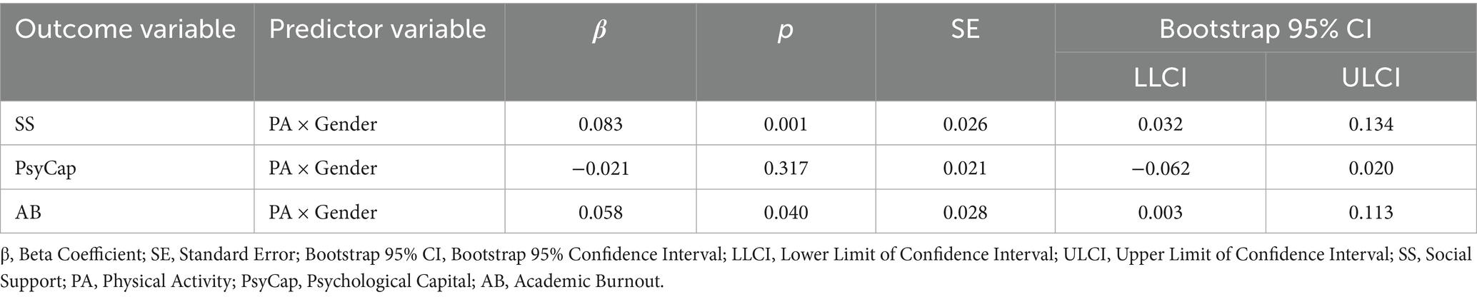 The results indicated that gender significantly moderated the relationships between PA and SS, as well as between PA and AB, supporting H5a and H5c. This study found that females appeared more likely to report increases in SS through PA, whereas males showed a stronger association between PA and lower levels of AB. The current findings corroborate the conclusions reached in the works of Shu et al. (2024) and Chen et al. (2022). Females often participate in group-based or socially oriented physical activities, which may promote interpersonal interactions and emotional exchanges (Day and Livingstone, 2003). Consequently, they may be more likely to perceive PA as a means to acquire SS, which could explain their stronger association between PA and SS (Eschenbeck et al., 2007). In contrast, males frequently emphasize personal achievement and self-improvement during PA, which helps them strengthen their sense of control over academic tasks and reduce feelings of burnout (Matud, 2004; Schöndube et al., 2017). Furthermore, this difference may stem from the influence of gender role socialization and cultural expectations. Traditional social norms emphasize women’s roles in relationship maintenance and social bonding, making them more likely to associate PA with the acquisition of SS. In contrast, men are often expected to demonstrate independence and achievement orientation, which leads them to rely more on PA as a way to strengthen coping ability and a sense of control when facing academic stress. However, existing research is not entirely consistent. Some studies suggest that women benefit more from SS than men, which is linked to their interaction patterns within social networks (Bedrov and Gable, 2023; Perrewé and Carlson, 2002). Other scholars, by contrast, have found that men more frequently adopt behavioral coping strategies, such as PA, when dealing with stress, and that such strategies may be more effective in alleviating negative emotions and academic stress (Wijndaele et al., 2007). Therefore, the moderating role of gender in these two pathways may originate from fundamental differences in coping strategies between men and women. These contradictory findings suggest that gender’s moderating role in the relationships between PA and SS and between PA and AB is shaped not only by sociocultural expectations but also by individual differences and contextual factors, thereby pointing to a more complex mechanism that warrants further investigation.