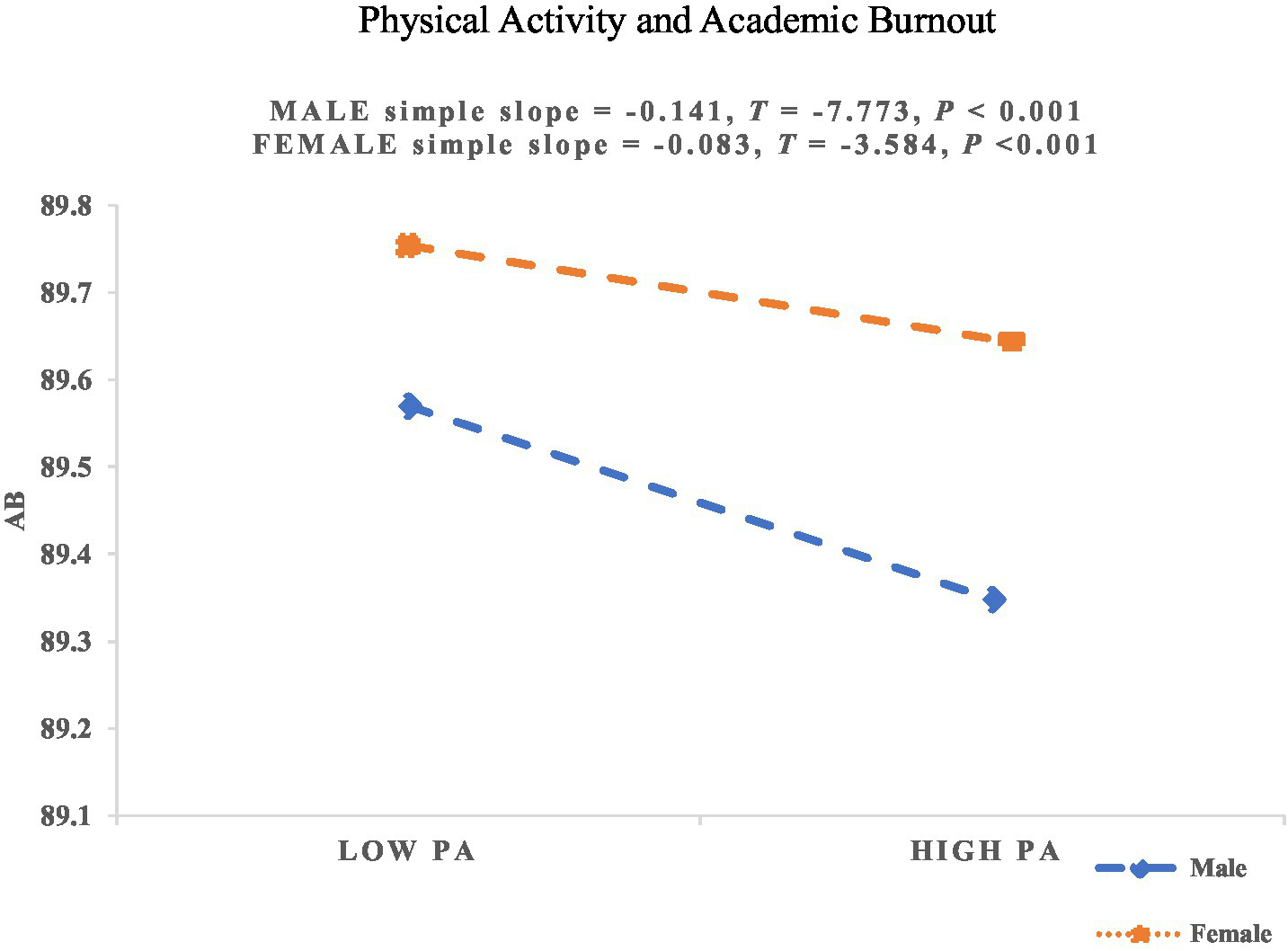 Furthermore, the direct association between PA and AB may also vary by gender. For many men, PA often serves as a primary strategy for stress relief and emotional regulation, which has been linked to lower AB (van Uffelen et al., 2017). Unlike men, women’s coping with academic stress tends to involve greater reliance on SS networks and emotional exchanges, which may reduce the direct benefits of PA on AB unless accompanied by additional support interventions (Eschenbeck et al., 2007). Additionally, differing societal expectations regarding the academic roles of male and female students may further contribute to gender-based variations in the PA–AB association. The moderating role of gender has also been confirmed across different national and cultural contexts. For example, González et al. (2023), in a study of Latino college students in the United States during the COVID-19 pandemic, found that the negative association between PA and AB was significant only among female students, whereas no such relationship was observed in the overall sample or in the male subgroup.