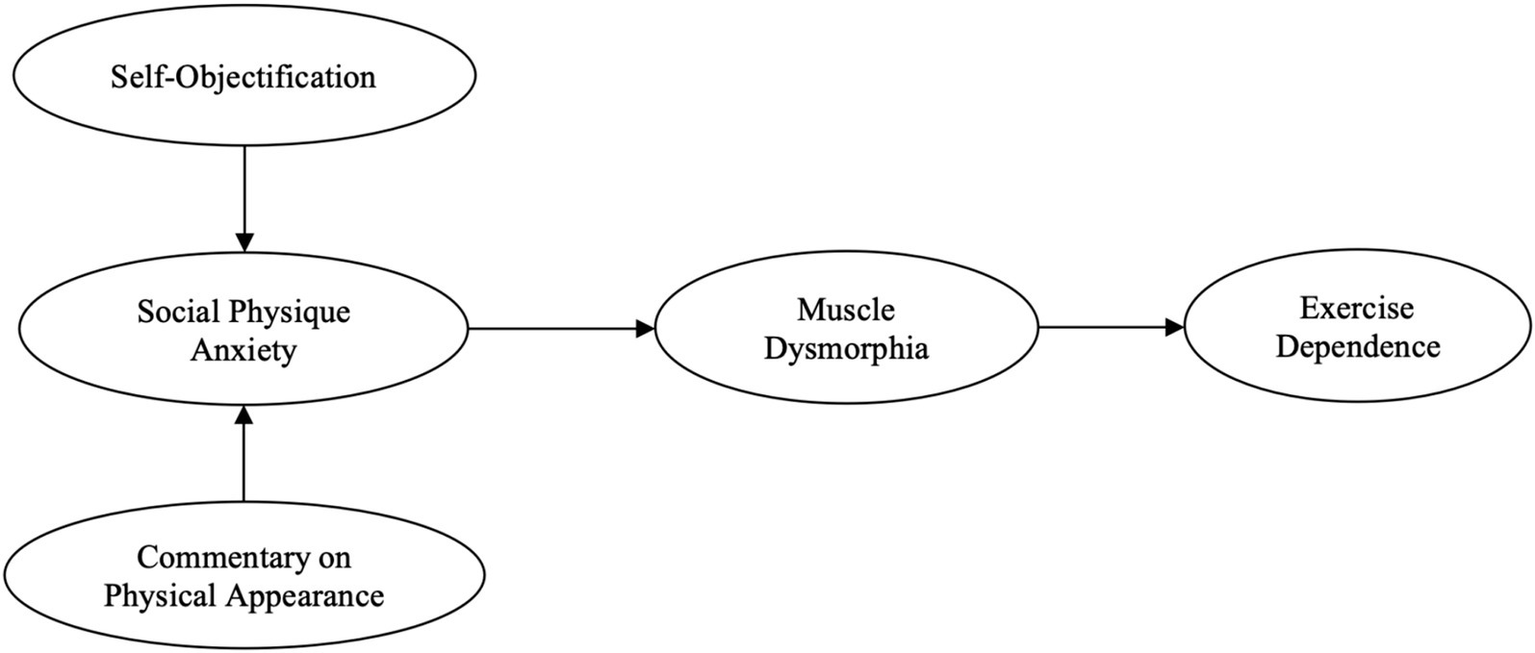 Integrating these relationships, a sequential mediation model is proposed in which self-objectification and commentary on physical appearance influence exercise dependence through the serial mediation of social physique anxiety and muscle dysmorphia. This pathway captures the progression from maladaptive cognitions and social influences to emotional dysregulation and ultimately to behavioral dependence. In line with the cognition–emotion–behavior sequence posited by the cognitive-behavioral framework (Cash, 2012), this study posits that social physique anxiety and muscle dysmorphia are key emotional and cognitive mechanisms linking appearance-related concerns to compulsive exercise. Thus, two serial mediation hypotheses are proposed: the relationship between self-objectification and exercise dependence is serially mediated by social physique anxiety and muscle dysmorphia (H5a), and the relationship between commentary on physical appearance and exercise dependence is serially mediated by social physique anxiety and muscle dysmorphia (H5b).
