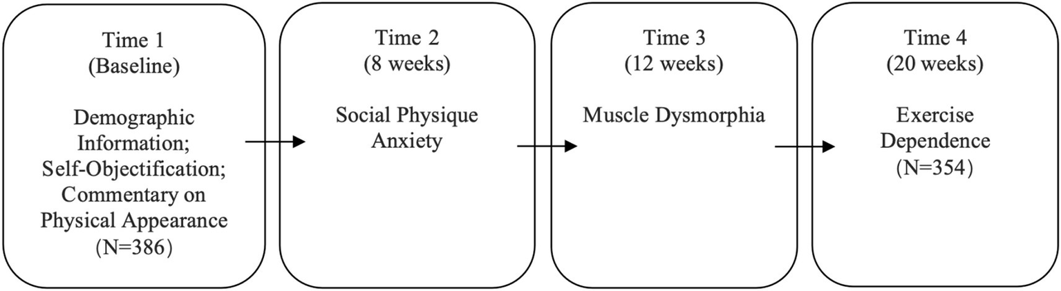 The study employed a four-wave survey design conducted over a 20-week period (study flow presented in Figure 2). All questionnaires were completed in the presence of trained research assistants at the gym clubs. At baseline, 386 male members volunteered and provided informed consent. Participants were assured of confidentiality and informed that they could withdraw at any stage. During the first survey (Time 1), participants reported demographic information and completed measures of self-objectification and commentary on physical appearance. Following Smith et al. (2016), seven professional bodybuilders were excluded at this stage to ensure sample comparability. The second survey (Time 2) was administered 8 weeks later and assessed social physique anxiety. Four weeks after that (12 weeks post-baseline), the third survey (Time 3) measured muscle dysmorphia. The final wave occurred 20 weeks after the initial survey and focused on exercise dependence (Time 4). Across the study, six participants were lost to follow-up and 19 discontinued regular exercise for more than 5 months, rendering them ineligible to complete the survey. The final sample comprised 354 male gym members, aged 24 to 48 years (M = 35.28), with an average fat-free mass index (FFMI) of 18.19 (SD = 3.04). Data collection took place between February 3 and June 3, 2024.
