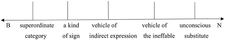 Among psychoanalytic literatures, the term symbol is employed in varying ways. Petocz (1999, p. 10–14) identifies five distinct meanings of symbol along a broad-to-narrow continuum, which is illustrated as follows (Figure 1).