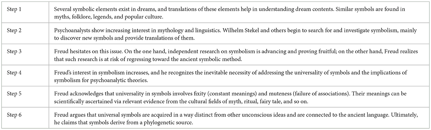 As mentioned earlier, prior to 1909, Freud's work is primarily focused on individual symbolism such as the formation of symptoms, and he limits his interest in and ambition for universal symbolism, presenting it only as a phenomenon. Petocz (1999, p. 57–59) summarizes Freud's shift toward universal symbolism, and we follow her recapitulation and present it as Table 1, which vividly illustrates Freud's cautious attitude and the factors that facilitate his transformation.5