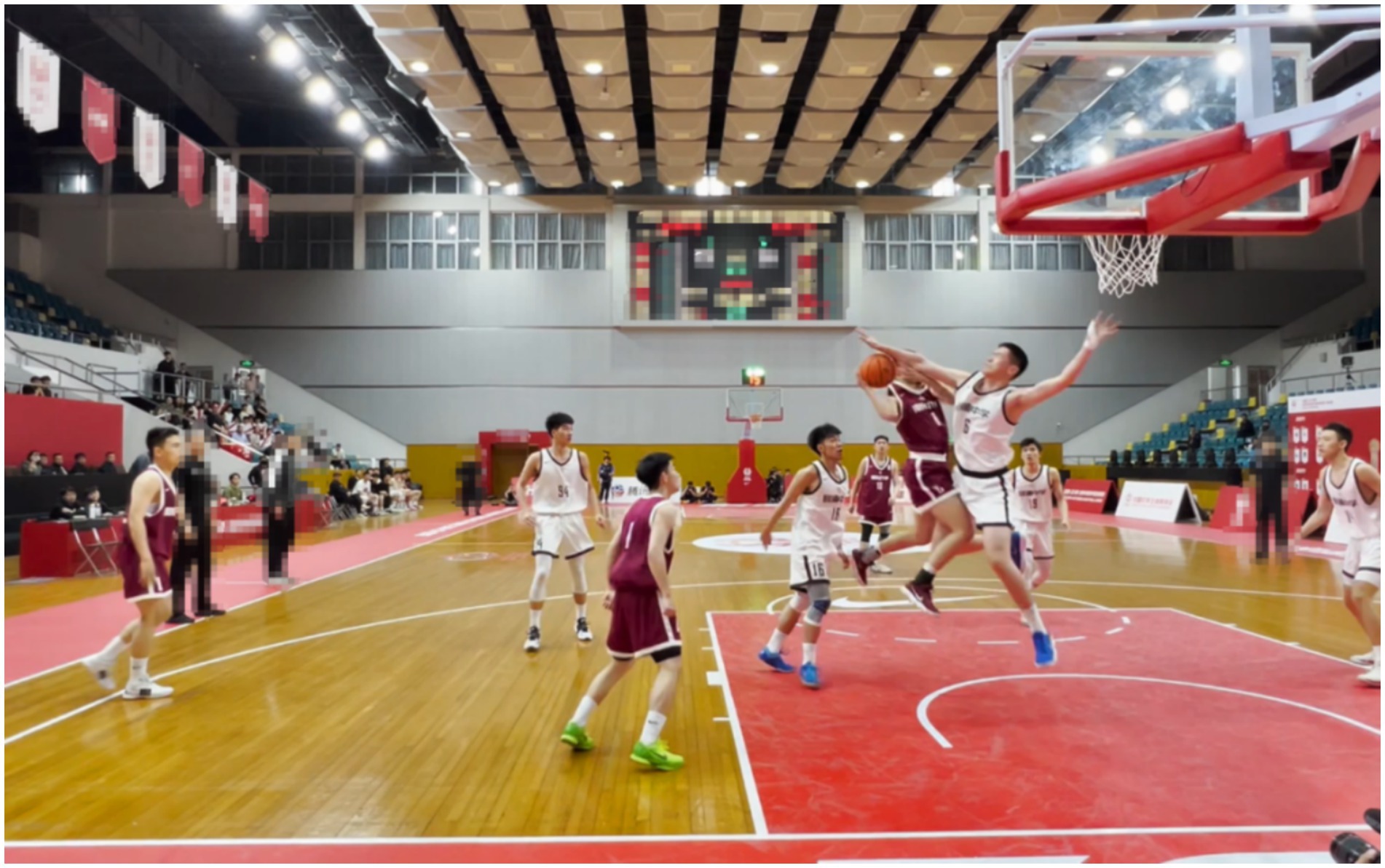 To design the experimental video clips, we carried out several steps. First of all, all videos are from the game clips of the China Nike High School Basketball League (the highest-level high school basketball competition in China) shot from the perspective of the lead referee (see Figure 1). The inclusion criteria for the videos are: ① there is physical contact; ② in an offensive or defensive situation; ③ violation situation occurs in the area of the lead referee; ④ there is only one foul or one violation in the video. After the author’s initial screening, 30 video clips were saved. However, this cannot be directly used as experimental material and needs to be further reviewed by experts. Secondly, the selection process of the experimental video clips was rather difficult. Therefore, a video review team (including the author, referee supervisors, referee lecturers and technical representatives from the Chinese Basketball Association) was established in this study, mainly to review whether the edited videos could be used as experimental materials. The team reaches a consensus on the penalty decision (for example, whether to commit a foul, and if so, what is the behavior of the foul?). And rule out particularly obvious fouls or violations. After review by the group, 10 videos were saved. Thirdly, we must meticulously edit these 10 videos. The videos start when ball-handling offense and defense situations occur (for example, the blue team fails to score while the red team gets the rebound and holds the ball until a defender appears in front of them), and end before the referee makes a decision. The referees in the video were also covered to prevent them from attracting the attention and interest of the subjects when they were watching the video. Finally, the referee supervisor, referee lecturers and technical representatives reviewed these 10 videos and checked the standards such as video length and clarity. Therefore, 10 video clips of the competition scenes with durations ranging from 10 to 30 s were generated. Each video contains only one possible violation. The video is played silently, eliminating crowds, referees, viewers, scores and advertisements to reduce the number of distractions.