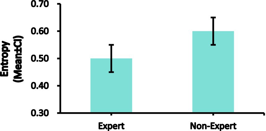 The entropy of expert referees (M = 0.50, SD = 0.18) is similar to that of non-expert referees (M = 0.60, SD = 0.20). There was no significant difference in entropy between expert and non-expert referees [F(1, 18) = 1.645, p > 0.213, ƞp2 = 0.058]. The entropy data are presented in Tables 1, 2 and Figure 8.