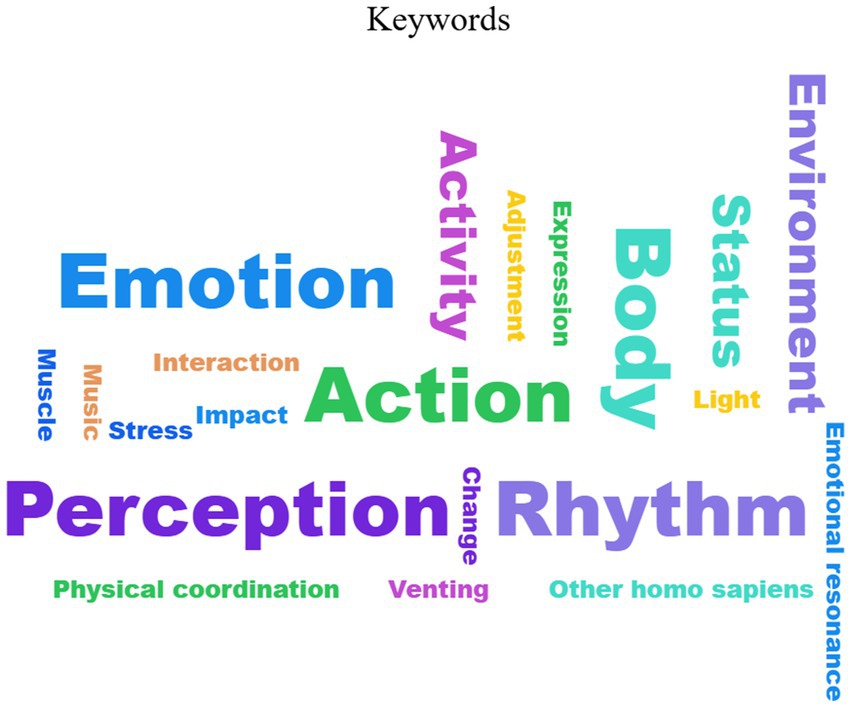 Textual data were analyzed using thematic content analysis and word frequency visualization with MicroWordCloud 2.0. High-frequency words (n = 25) included “body,” “movement,” “perception,” “coordination,” “adjustment,” and “emotion.” Two independent coders categorized the terms, achieving a 0.70 inter-rater agreement rate. After multiple coding iterations, four major categories were identified: