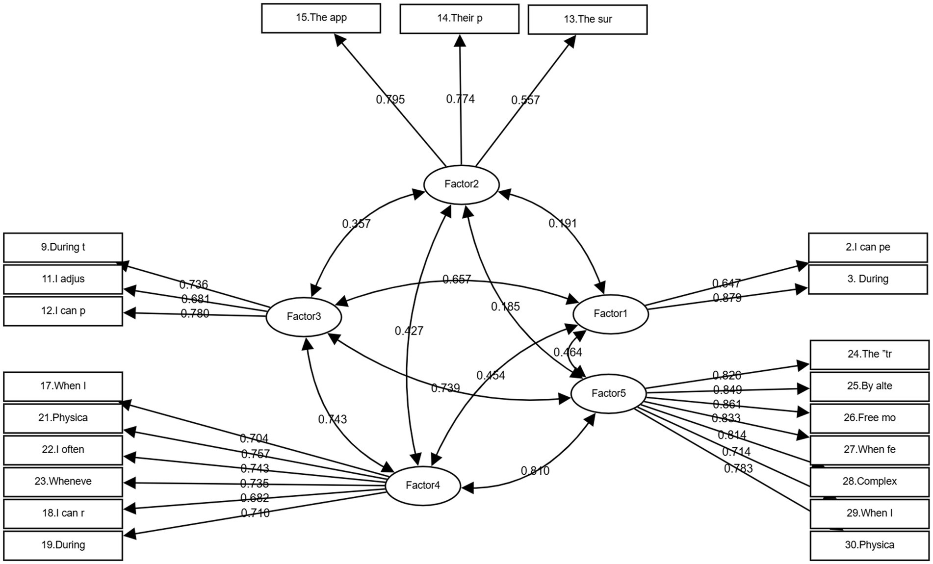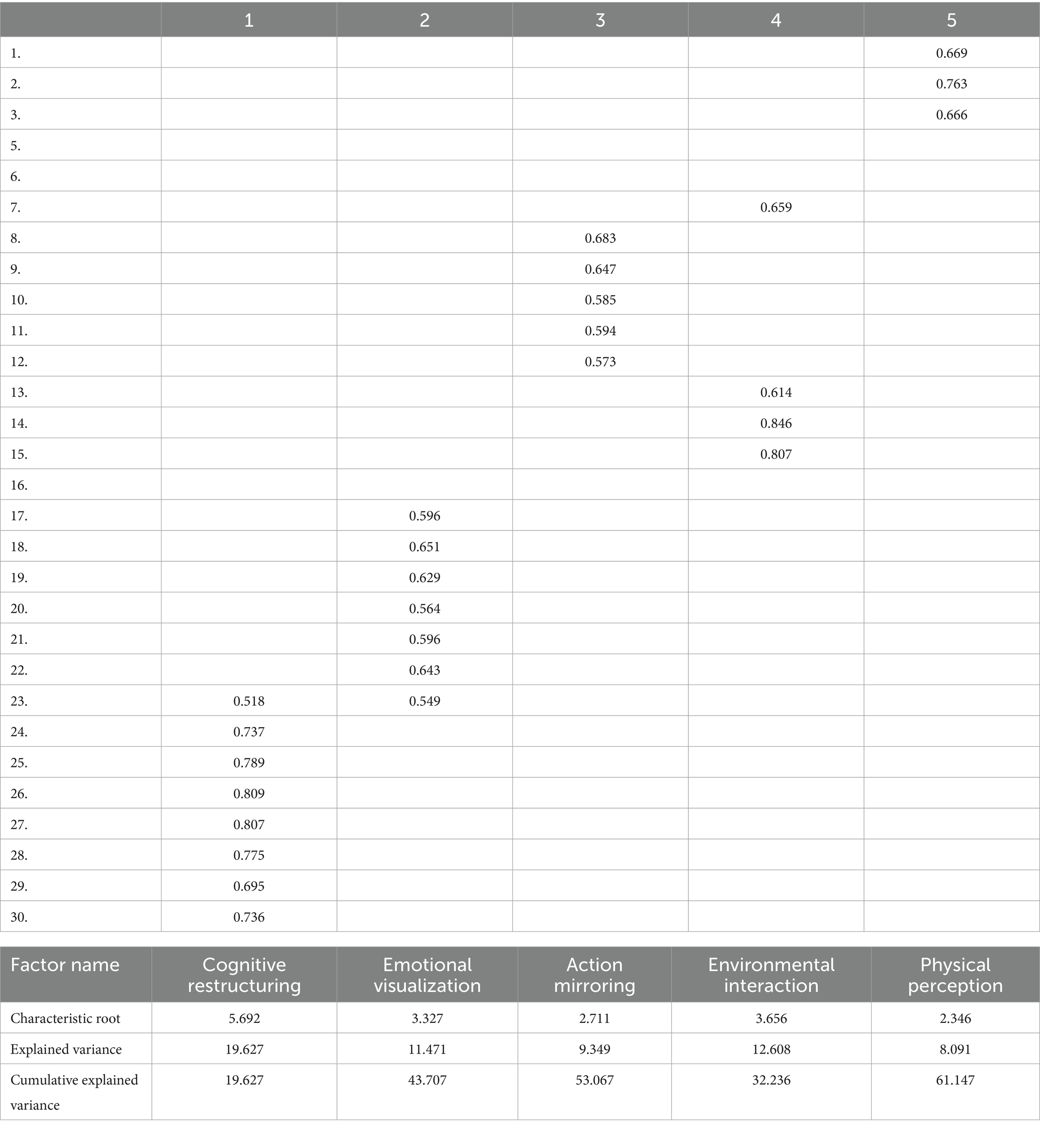 Five initial factors were extracted through principal component analysis, with a cumulative variance contribution rate of 61.147%, indicating that the factor structure can effectively explain the variation in the original data. The cognitive restructuring factor, which has the strongest explanatory power, encompasses items 25, 26, 27, 28, 24, 30, and 29. These items collectively reflect the function of physical activity in reshaping high-order cognitive strategies, fully aligning with the “cognitive regulation” dimension in the theoretical framework. The environmental interaction factor consists of items 14, 15, 7, and 13, highlighting the dynamic interaction between environmental stimuli and bodily perception, which echoes the integration theory of “body and environment.” The emotional concretization factor includes items 18, 19, 22, 21, 20, and 8, systematically representing the concrete path of emotional expression through the body, in line with the theoretical concept of “emotional expression.” The social synchronization factor integrates items 9, 11, 10, and 12, revealing the coordination mechanism of the body in social situations, corresponding to the theoretical dimension of “social embodiment.” The fundamental bodily perception factor is composed of items 2, 3, 1, and 17. These physiological perception items form the underlying basis of embodied cognition, consistent with the theoretical assumption of “body awareness.”