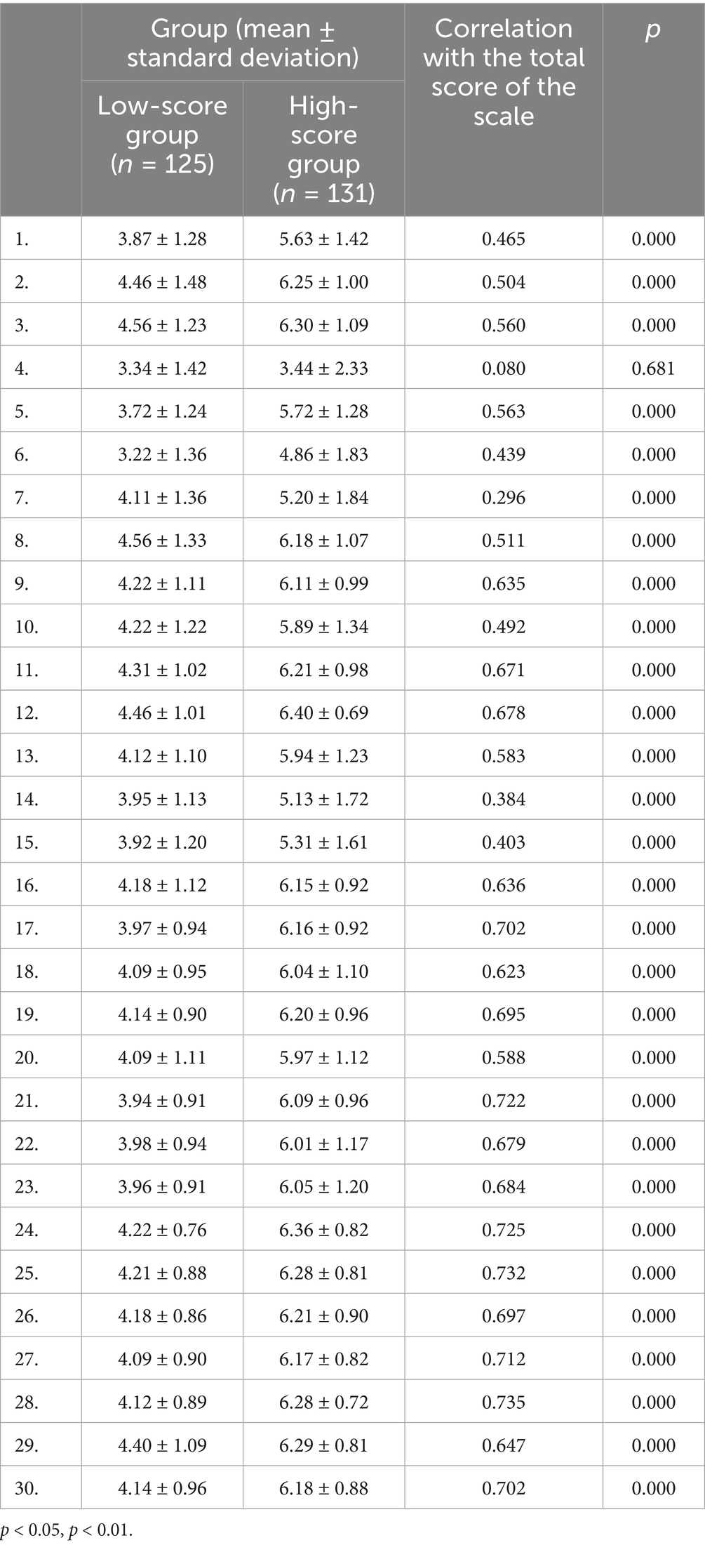 In the discriminant analysis of the items on the Embodied Cognition Scale, the scores of the analysis items are first summed up. Then, they are divided into high-score and low-score groups, with the 27th and 73rd percentiles as the boundaries. Subsequently, a T-test is used to compare the differences between the high-score and low-score groups. If there are differences, it indicates that the scale items are appropriately designed (Kelley, 1939); otherwise, it means that the scale items cannot distinguish information, and the design is unreasonable and the items should be deleted. As shown in Table 1, when analyzing items 1–30, 29 items show very obvious discrimination between the low-score and high-score groups, as all p-values are less than 0.01. However, for “Analysis Item 4,” p = 0.681 > 0.05, and the correlation with the total scale score is 0.08 > 0.02, which means that there is no good discrimination between the low-score and high-score groups for “Analysis Item 4.” The low correlation coefficient implies that “Analysis Item 4” probably needs to be deleted or modified.
