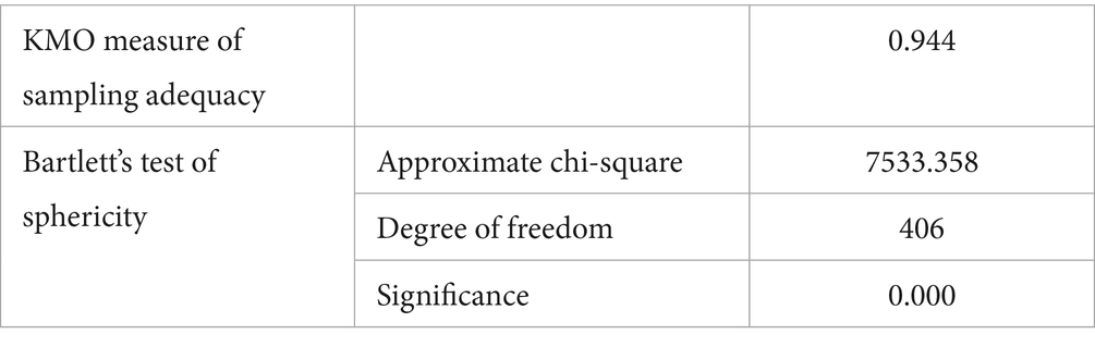 After the discriminability analysis in the first step, factor analysis for dimensionality reduction of these 29 items was conducted in SPSS 27. The KMO test value was 0.944, indicating a significant correlation between variables. The Bartlett’s test of sphericity yielded a χ2 value of 7533.358 (p = 0.000). These indicators jointly verified the statistical feasibility of factor analysis, confirming that the data were suitable for factor analysis (Table 2).
