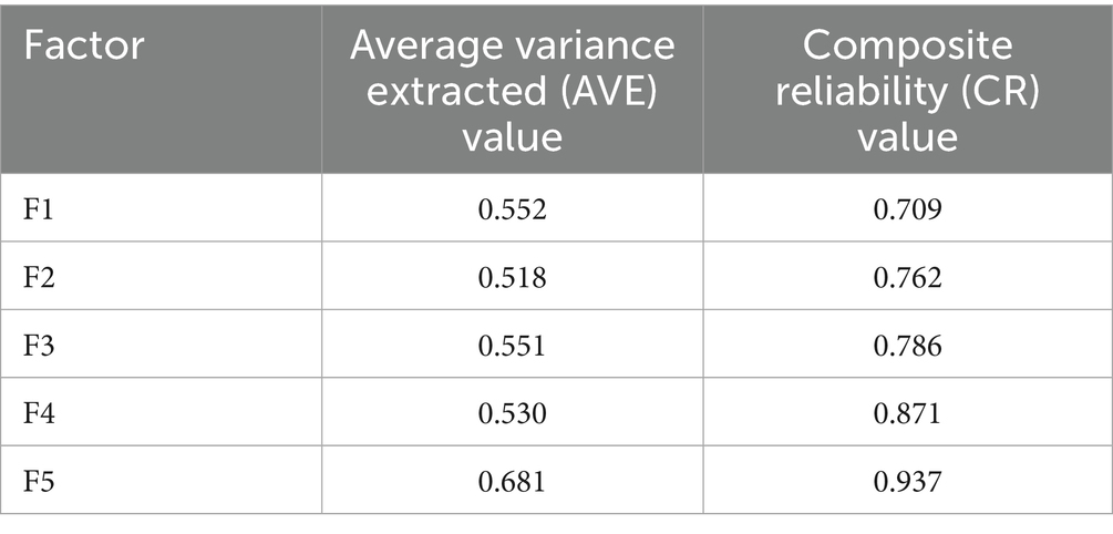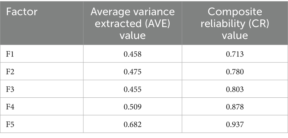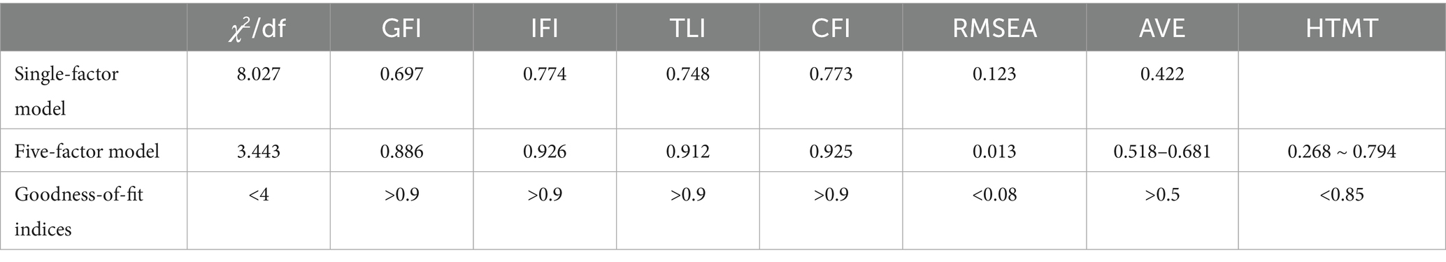 To validate the rationality of the five-factor structure of the scale, all 21 items were regarded as a single factor, and confirmatory factor analysis was used to conduct goodness-of-fit tests on the single-factor model and the five-factor model, respectively. The results showed that the fit indices of the single-factor model indicated poor goodness of fit, suggesting that this model failed to adequately fit the data and reflecting the irrationality of the single-factor structure. In contrast, the fit indices of the five-factor model were significantly improved and reached or approached the ideal standards, confirming that the five-factor structure had stronger theoretical rationality and statistical goodness of fit (Table 6). Therefore, the five-factor model outperformed the single-factor model and provided robust support for the construct validity of the scale.