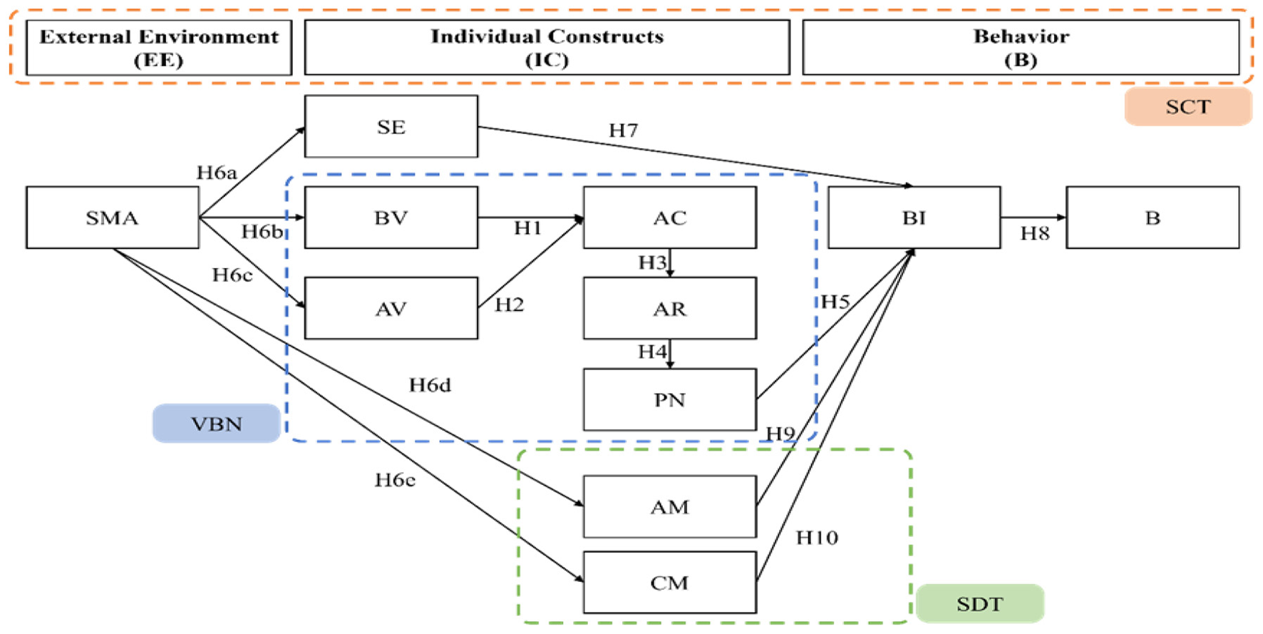 SMA plays a crucial role in influencing purchasing behavior by engaging individuals and integrating brands into their daily lives (Kumaradeepan, 2021). Jahari et al. (2022) employed campus advertisements to examine sustainable behaviors among young individuals within the SCT framework and found that SMA positively influences SE (Trejo et al., 2024). Additional research indicates that social media can elevate awareness of green consumption among young people in China, with subjective norms and perceived green values serving as mediators (Xie and Madni, 2023). Kumar and Pandey (2023) emphasized that social media can generate motivations that affect green purchasing intentions and behaviors. Zhang (2023) also identified that social media marketing can alter individuals' thoughts and emotions, thereby impacting their purchasing behavior. Based on these findings, this study proposes the following hypotheses: