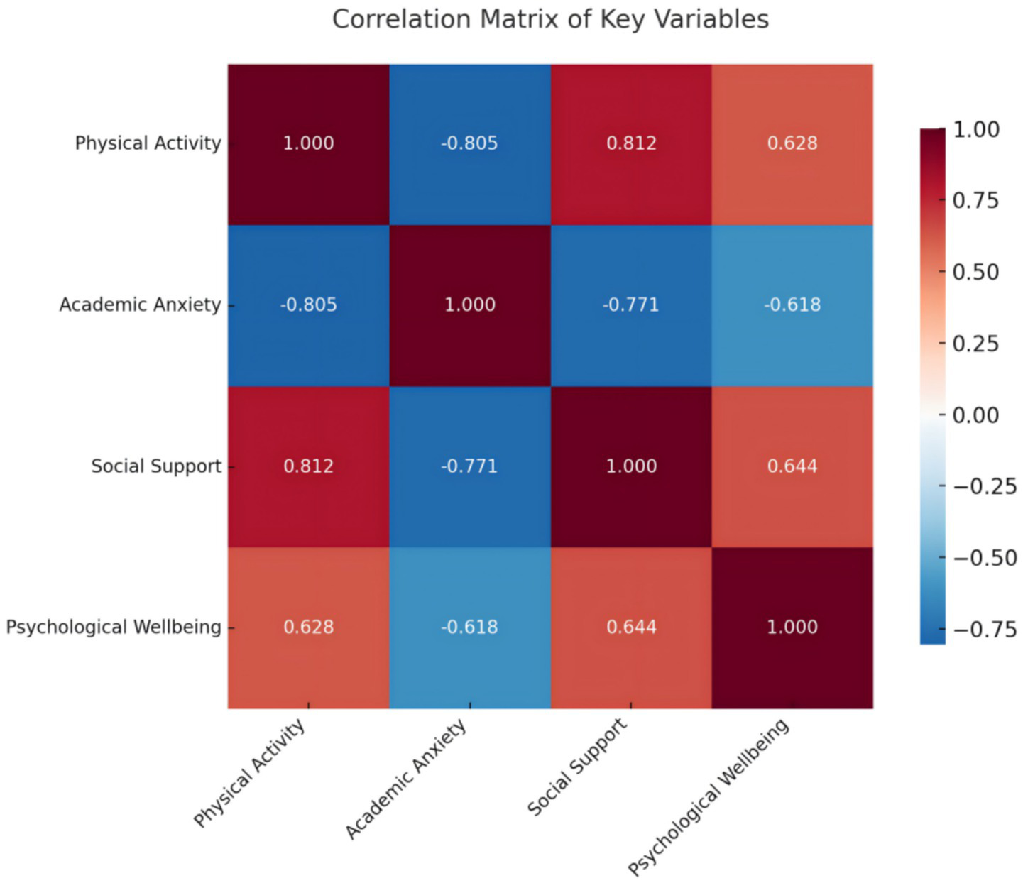 Pearson correlation coefficients were calculated to examine the bivariate relationships among physical activity, academic anxiety, social support, and psychological well-being. The results are presented in Table 3 and Figure 2.