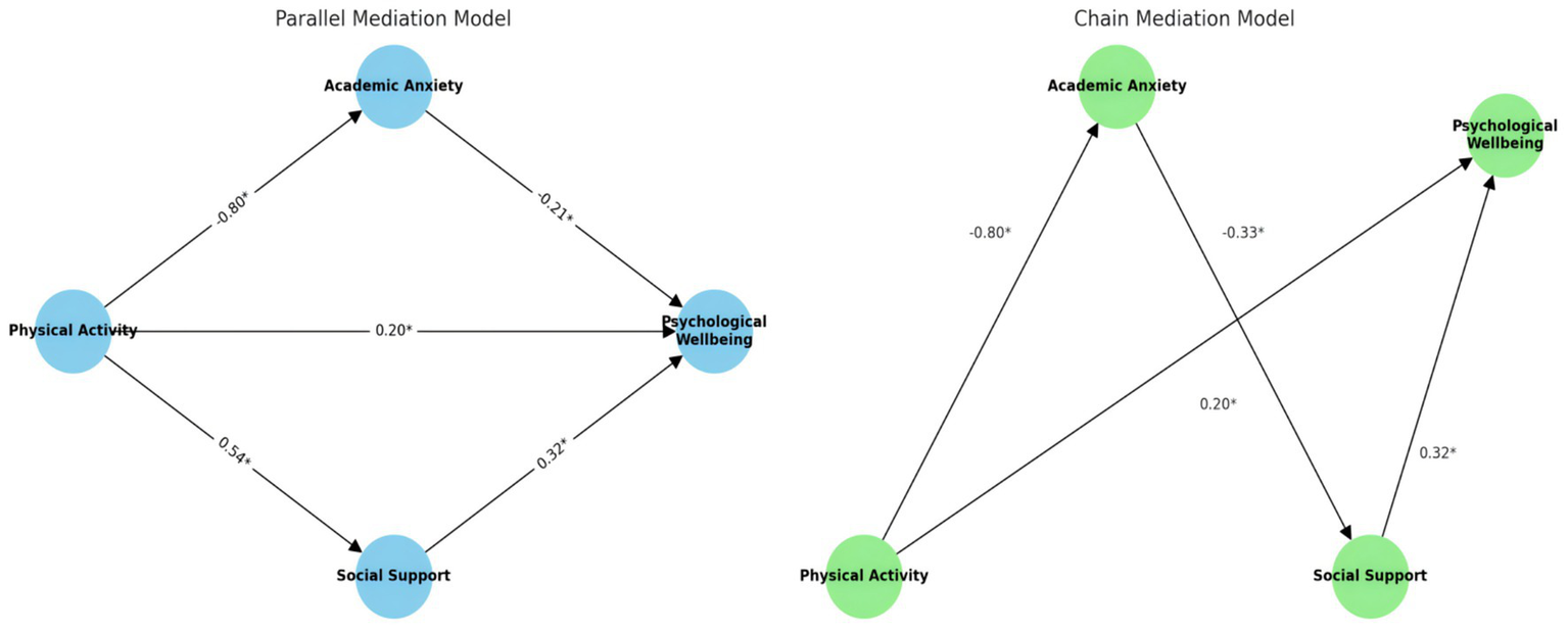 However, psychological functioning is often shaped by multiple parallel pathways. In light of this, the present study also incorporates a parallel mediation model, hypothesizing that academic anxiety and social support independently mediate the relationship between physical activity and psychological well-being. This dual-model approach enables a more nuanced understanding of whether the mediators act in a complementary or interdependent fashion, and which pathway exerts a stronger influence.