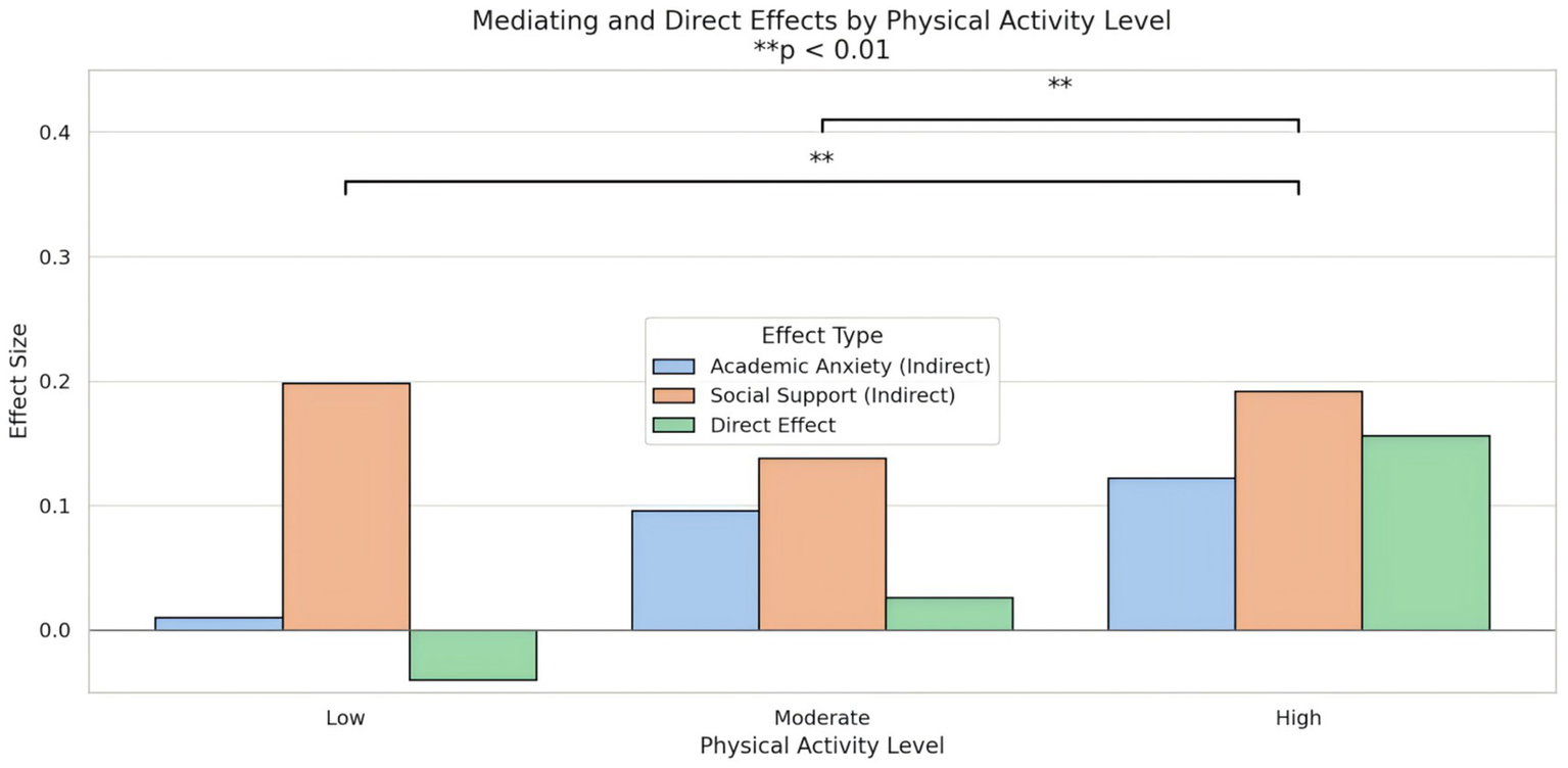Physical activity served as the independent variable, mental health as the dependent variable, and academic anxiety and perceived social support as mediating variables. Bootstrapping: 5,000 bootstrap resamples were used to test the indirect effect, generating bias-corrected 95% confidence intervals. Mediation effects were considered significant if the confidence interval did not contain zero.