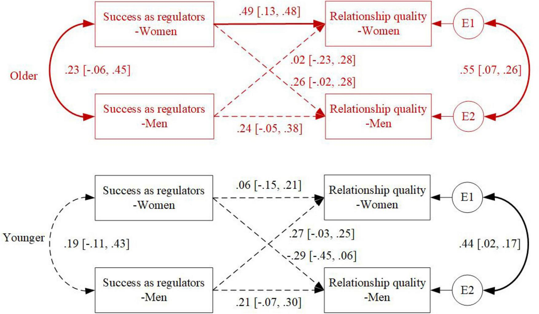 Regarding age differences in the associations between perceived success as regulators and relationship quality, MGA revealed that the actor effects between women’s perceived success as regulators and their own relationship quality were more significant for older couples than for younger couples (2loge(BF) = 8.54; Older: β = 0.49, 95% CI [0.13, 0.48]; Younger: β = 0.06, 95% CI [−0.15, 0.21]), in line with H5 (see Figure 2).