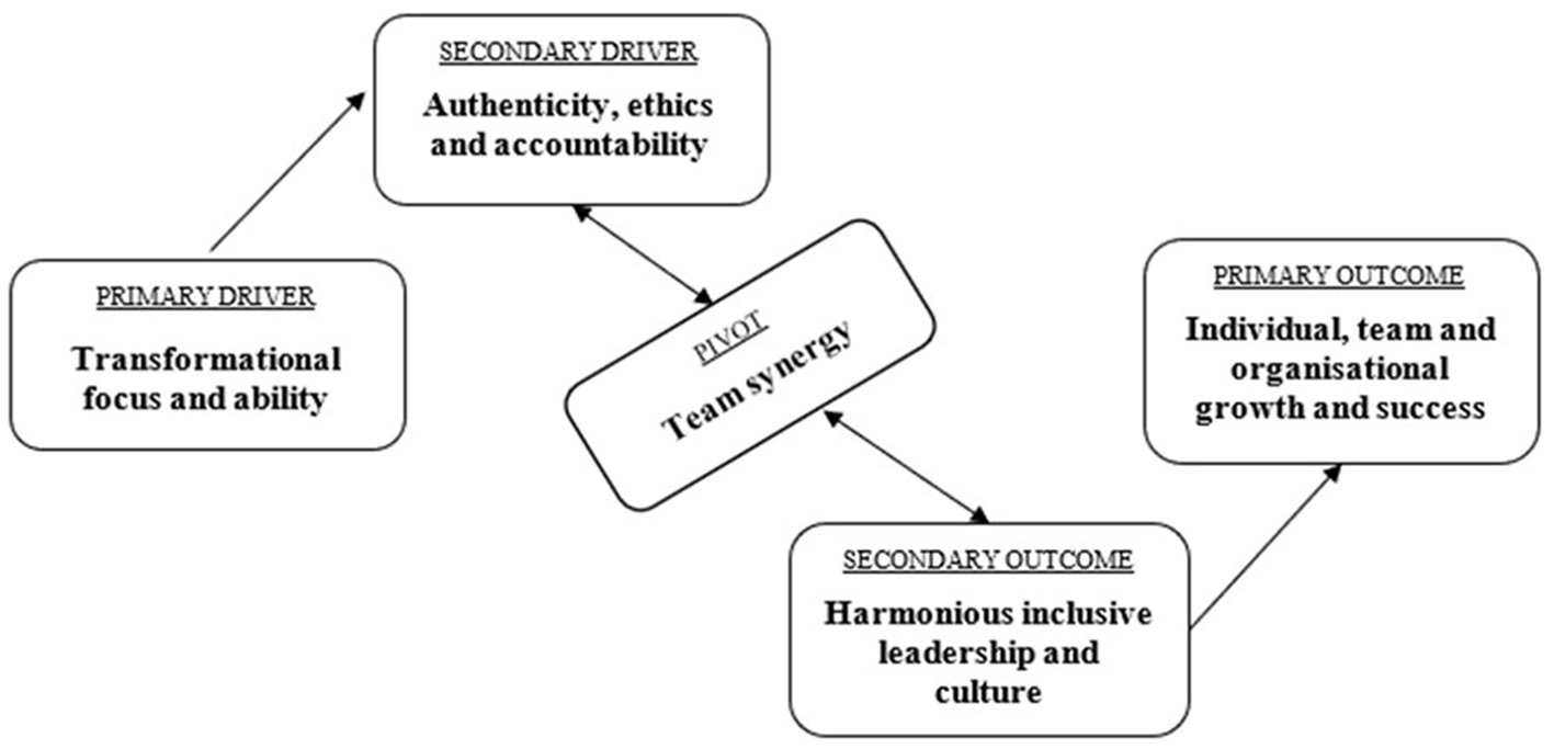 The third affinity group included the pivot affinity from focus group 2, joining forces, and a secondary outcome affinity from focus group 3, inclusive team–driving success through others. These affinities highlighted participative processes, togetherness, collaboration and common goals. This affinity group is supported in one of the themes identified in the systematic literature review conducted by authors prior to this study (Ubuntu-related leadership can be described as participatory and values based) as well as by Grobler and Singh (2018) and Mangaliso et al. (2021). The pivot in the intuitively created SID is called Team synergy.