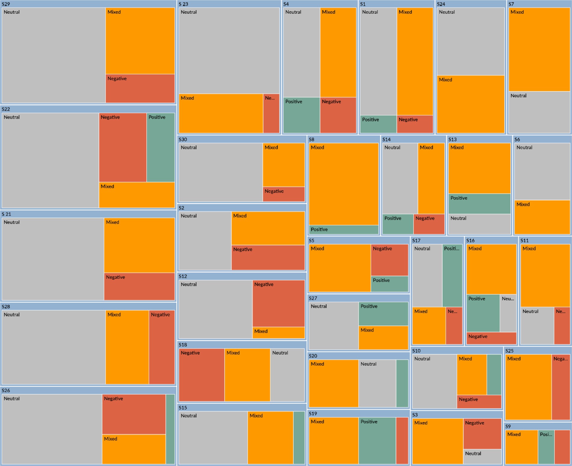 The result of Study 2 is shown in Table 4 and Figures 3, 4. Study 2 was conducted differently from Study 1. In a regular writing class of a college English course, participants are assigned to describe their opinions and feelings about friendship. Friendship is an interesting and relatable topic that represents the internal and external relationships between individuals and the world around them. The students are provided with two articles by Roger Baumgarte, which discuss how cultural differences influence friendships. One is a reading assignment in our English course textbook, which is excerpted from Roger’s book, Friends Beyond Borders. The other is a chapter titled “Interveners and Independents” from his research paper (Baumgarte, 2016). These two articles are at an average level of English, and participants are encouraged to express their specific emotions through reading and writing. Figure 3 is the sentiment coding from NVivo 15.0 for the emotions of 35 participants (S1, S2, S3…, S35). Compared with Figure 1, Figure 3 shows fewer negative emotions; most participants express positive, mixed, or neutral emotions. This result suggests that when participants relate cultural differences to real life, they think positively and neutrally.