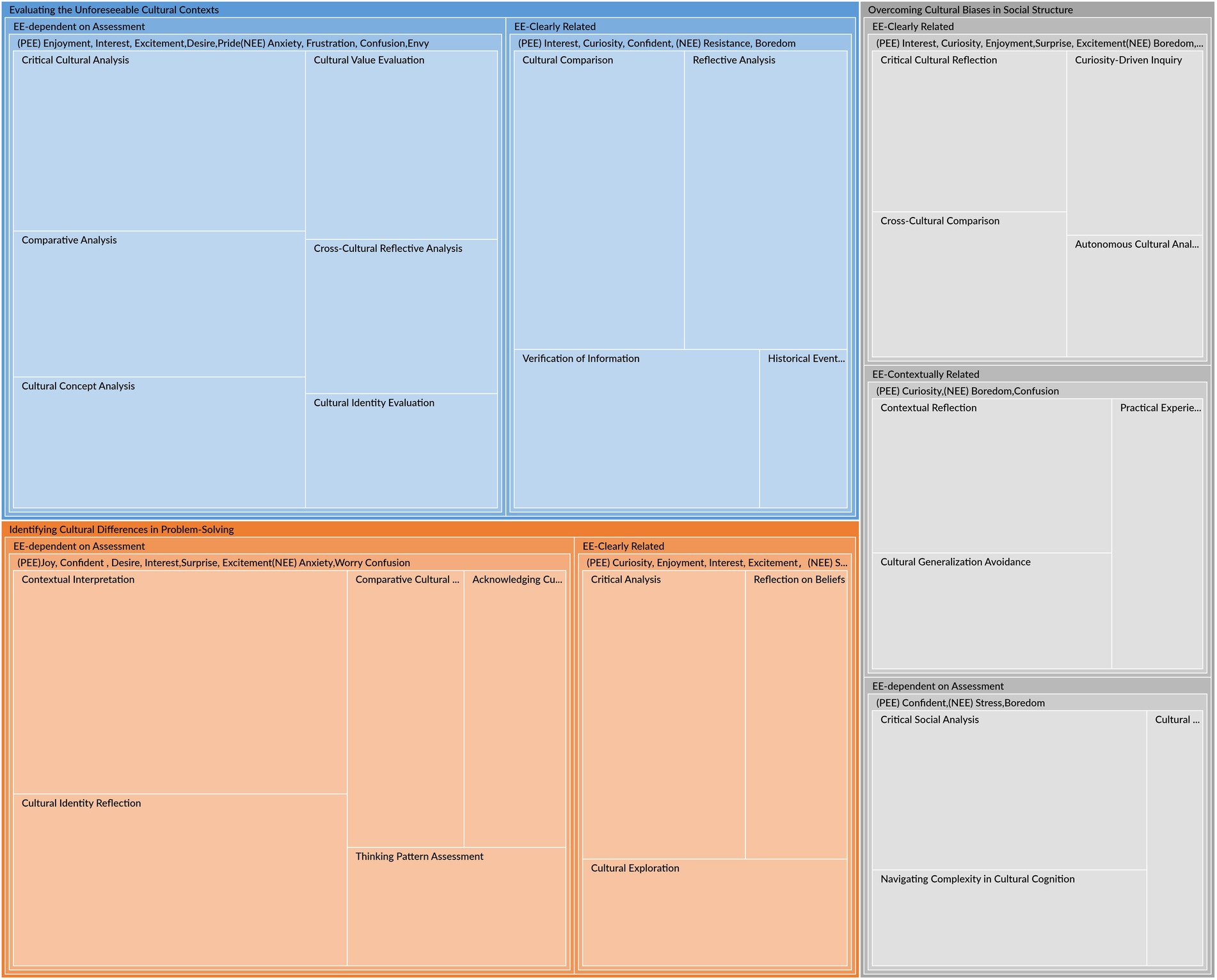 “Identifying Cultural Differences in Problem-Solving (ICDPS)” is vital for applying critical thinking to cultural challenges. Figure 2 and Table 1 illustrate that this theme includes EE-Clearly Related and EE-Dependent on Assessment.