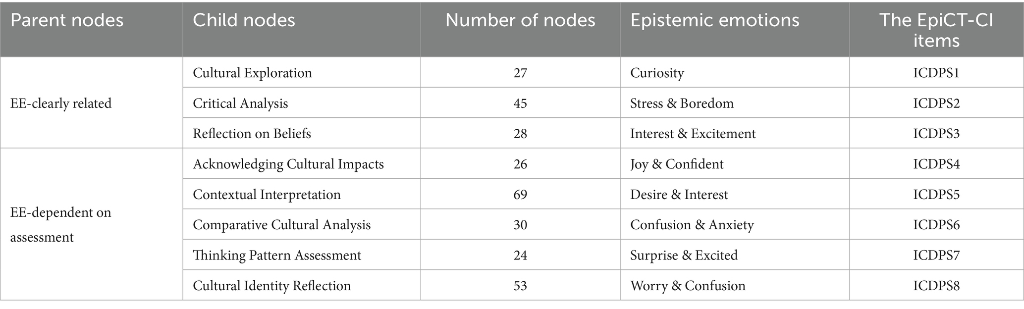 The EE-Clearly Related activities are characterized by Critical Analysis (45), Cultural Exploration (27), and Reflection on Beliefs (28). These activities represent critical thinking applications, such as analyzing, recognizing, reflecting, and comprehending, which are associated with positive epistemic emotions (curiosity, enjoyment, interest, excitement) and negative epistemic emotions (stress, boredom). Items ICDPS1, ICDPS2, and ICDPS3 are based on these results. The EE-dependent on Assessment activities involve Acknowledging Cultural Impacts (26), Comparative Cultural Analysis (30), Contextual Interpretation (69), Cultural Identity Reflection (53), and Thinking Pattern Assessment (24). These activities represent the assessing, comparing, and verifying in critical thinking applications, which are associated with a mix of positive epistemic emotions (joy, confidence, desire, interest, surprise, excitement) and negative epistemic emotions (worry, confusion, anxiety). These epistemic emotions highlight the complexity of engaging with cultural differences, where individuals may experience enthusiasm or frustration in cultural identity reflection and in navigating the dynamic and multifaceted nature of cultural differences. Based on the findings, items ICDPS4, ICDPS5, ICDPS6, ICDPS7, and ICDPS8 are created.