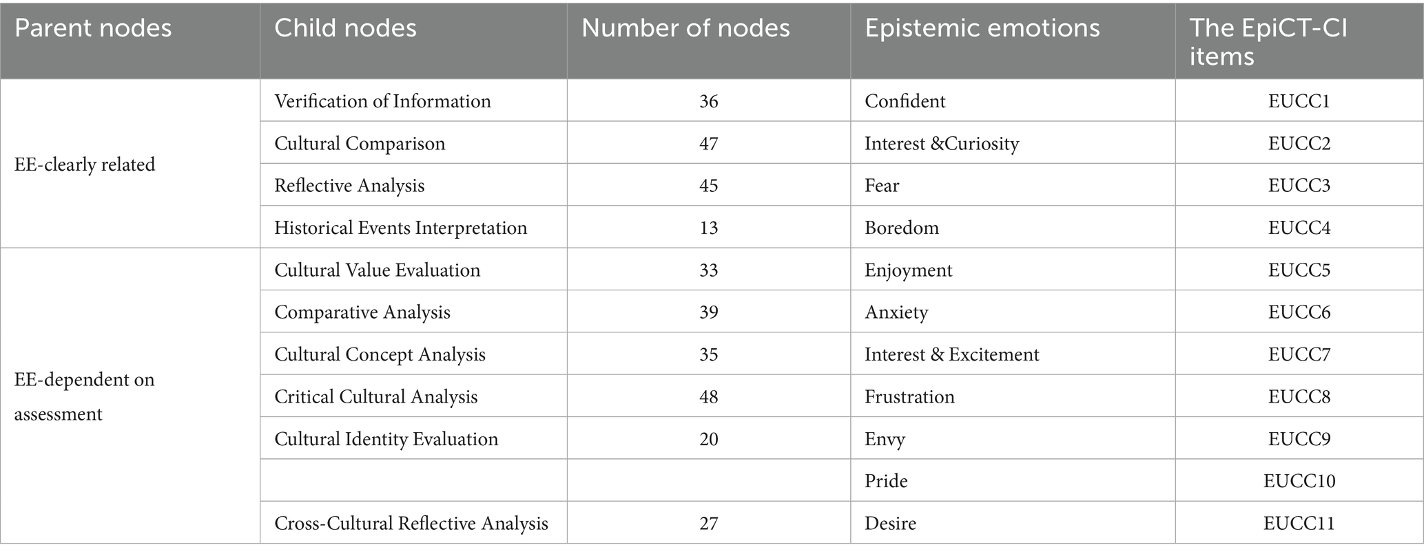 The theme “Evaluating the Unforeseeable Cultural Contexts (EUCC)” provides a structured approach to applying critical thinking in evaluating and analyzing cultural contexts. As Figure 2 and Table 2 show, this theme also encompasses two parent nodes related to epistemic emotion activities: EE-Clearly Related and EE-dependent on Assessment.
