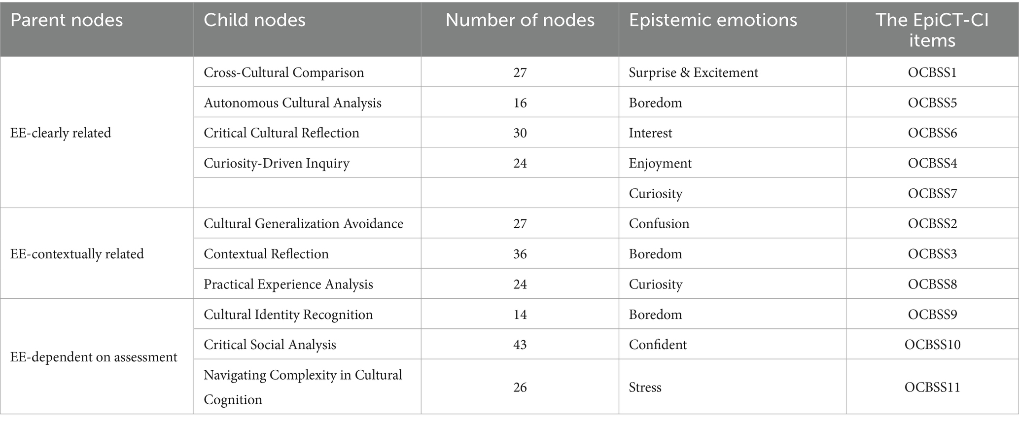 As Table 3 demonstrates, the “EE-Clearly Related” involves the activities that are directly associated with overcoming cultural biases: Cross-Cultural Comparison (27), Critical Cultural Reflection (30), Autonomous Cultural Analysis (16), and Curiosity-Driven Inquiry (24), which represent the establishment of comprehensive insights into cultural biases through critical thinking. The related positive epistemic emotions (surprise, excitement, interest, curiosity, enjoyment) drive individuals to reflect on cultural issues and evaluate cultural bias critically. In contrast, negative epistemic emotions (boredom) obstruct the process of personal understanding of cultural biases. Table 3 shows that OCBSS1, OCBSS5, OCBSS6, OCBSS4, and OCBSS7 are created in this category.