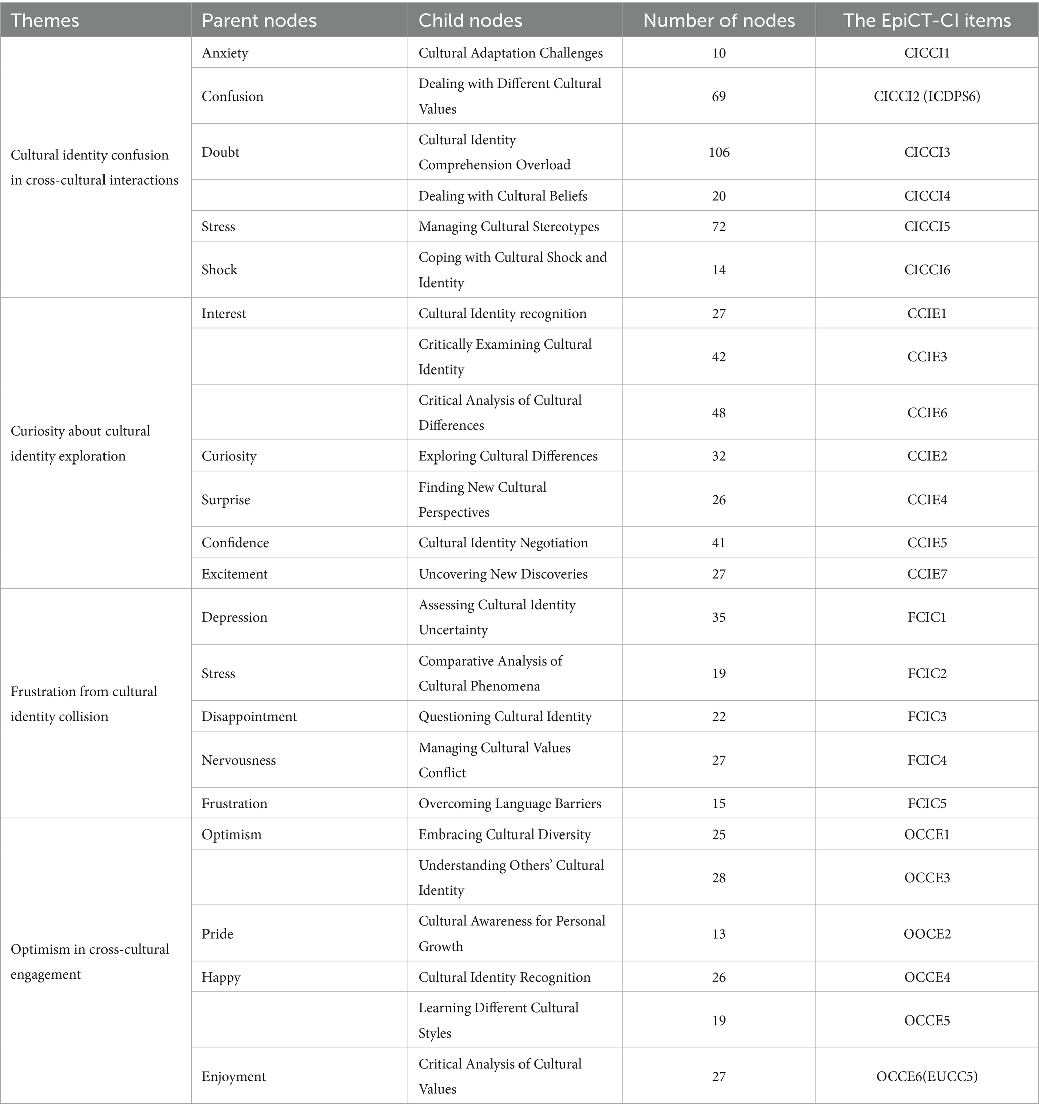 The parent node Anxiety includes Cultural Adaptation Challenges (10). Confusion involves Dealing with Different Cultural values (69). Doubt involves Dealing with Cultural Beliefs (20) and Cultural Identity Comprehension Overload (106). Stress involves Managing Cultural Stereotypes (69). Shock includes Coping with Cultural Shock and Identity (14). These epistemic emotions demonstrate the mixed feelings that participants experience in interpersonal interactions in different cultures when constructing cultural identity. Based on every activity associated with each epistemic emotion, items CICCI1, CICCI2, CICCI3, CICCI4, CICCI5, and CICCI6 of the EpiCT-CI Scale are created. Due to the epistemic emotion “Confusion” (Dealing with Different Cultural Values) in this theme being closely connected to “Confusion & Anxiety” (Comparative Cultural Analysis) in the theme ICDPS of Study 1, these two nodes are linked by the shared item CICCI2 (ICDPS6).