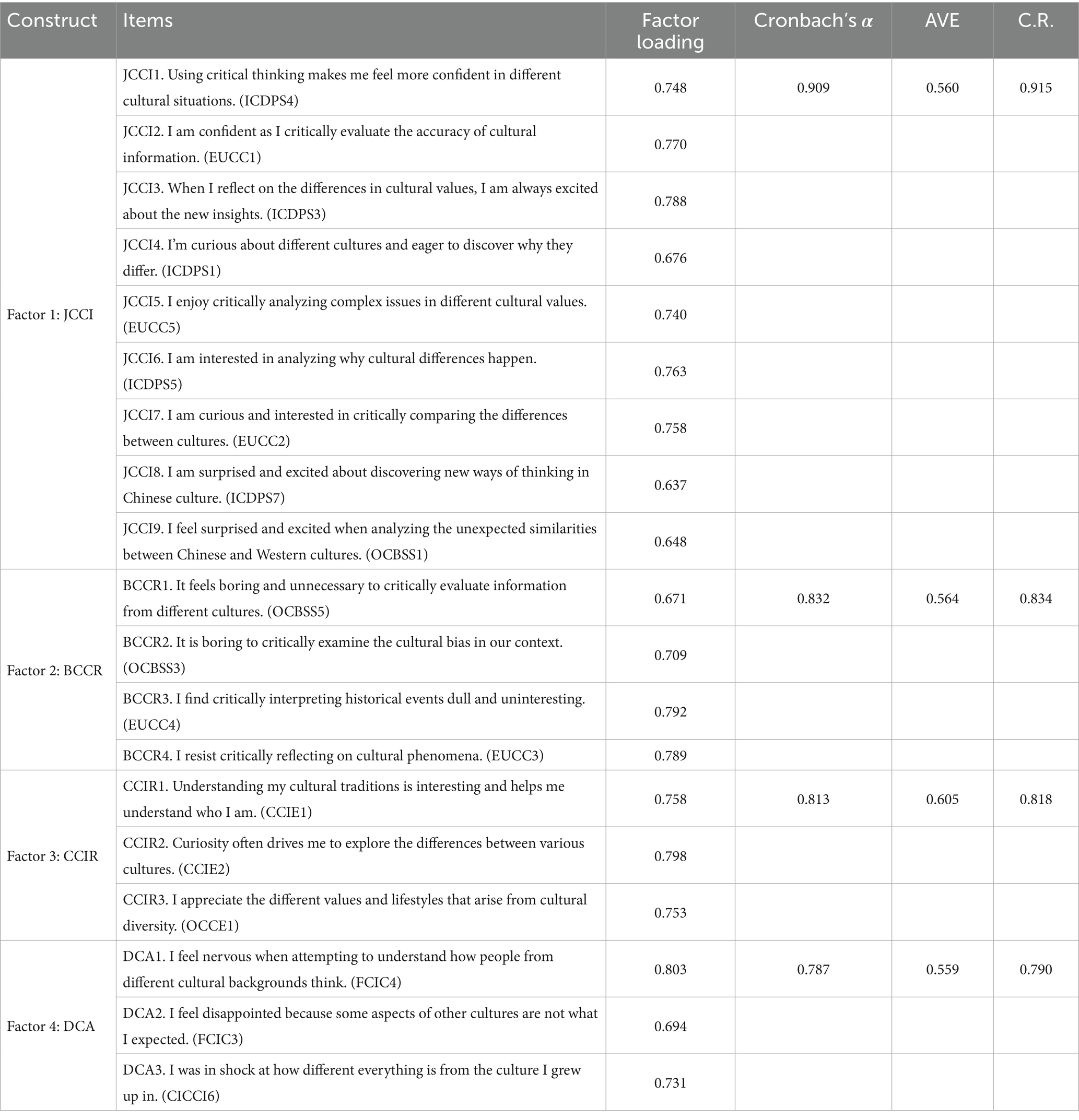 Furthermore, epistemic emotions are rarely included in critical thinking and cultural identity inventories. Measurements of critical thinking are various, such as the Watson-Glaser Critical Thinking Appraisal (WGCTA, Watson and Glaser, 1985) and the California Critical Thinking Disposition Inventory (CCTDI, Facione, 1989); other new inventories assess the attitude and belief about critical thinking, like the Critical Thinking Toolkit (CriTT, Stupple et al., 2017), the Questionnaire of Attitudes Towards Critical Thinking (QATCT, Manassero-Mas et al., 2022), and the Student-Educator Negotiated CT Dispositions Scale (SENCTDS, Quinn et al., 2020). Additionally, the inventories of identity and cultural identity are also abundant, such as Bicultural Identity Integration Scale (BIIS-1, Haritatos and Benet-Martı́nez, 2002), Multigroup Ethnic Identity Measure (MEIM, Phinney, 1992; Phinney and Ong, 2007), Ethnic Identity Scale (EIS, Umaña-Taylor et al., 2004), Self-Concept and Identity Measure (SCIM, Bogaerts et al., 2018), and Multigroup Ethnic & National Identity Measure (MENI, Maehler et al., 2019; Maehler et al., 2025). However, these measurements seldom contain epistemic emotions. Critical thinking application and cultural identity construction are significant in the learning process of coping with cultural differences. Therefore, in this research, the EpiCT-CI Scale is developed to offer a more comprehensive framework for exploring the complex relationships between emotions, cognition, and cultural contexts. By integrating critical thinking and cultural identity within the measurement of epistemic emotions, this scale explores how individuals’ evaluation of cultural information influences their epistemic emotions, highlighting the significant role of epistemic emotions in shaping the cognitive processes and developing cultural identity.