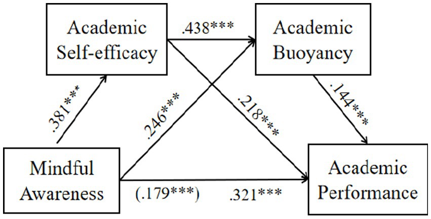 Results: The results showed that mindful awareness had a significant positive effect on academic performance (β = 0.179). This relationship was partially mediated through two pathways: academic self-efficacy (β = 0.083) and academic buoyancy (β = 0.035). Additionally, a serial mediation pathway through both mediators was significant (β = 0.024). These indirect effects collectively accounted for 44.2% of the total effect, suggesting that mindful awareness enhances academic performance both directly and indirectly through increased academic self-efficacy and buoyancy.
