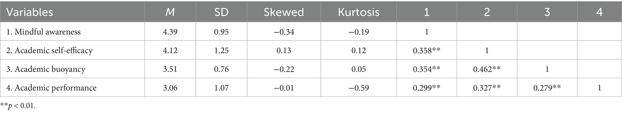 Social cognitive theory posits that physiological and emotional states constitute critical factors influencing the formation of individual self-efficacy. Negative emotional states such as stress lead individuals to underestimate their capabilities, thereby exerting adverse effects on self-efficacy (Liu et al., 2024). Mindful awareness is typically defined as intentional, non-judgmental attention to present-moment experiences (Bishop et al., 2004). Through facilitating decentering, it enables individuals to reappraise stressful events and negative emotions as transient mental states rather than self-invested authentic experiences, thereby down-regulating the processing of stressful events and emotional responses (Lebois et al., 2015). This suggests that mindful awareness can mitigate psychological stress perception by enhancing individuals’ emotional awareness and regulation capacity (Bao et al., 2015), consequently buffering the negative impact of adverse emotions on self-efficacy. Recent empirical evidence indicates that mindful awareness is significantly and positively associated with individual self-efficacy (Li and Tong, 2024). When individuals possess high academic self-efficacy, they are more likely to develop confidence in learning, tend to select challenging academic tasks, and persist in academic engagement when encountering difficulties (Aldbyani et al., 2024). Therefore, students with higher levels of mindful awareness may enhance their academic performance through elevated academic self-efficacy.