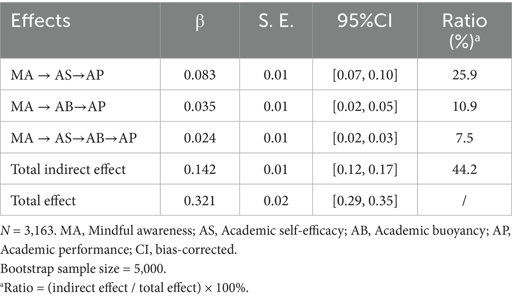 Figure 2 presents the results of the direct path tests. The results showed that mindful awareness had significant positive effects on both academic self-efficacy (β = 0.381, p < 0.001) and academic buoyancy (β = 0.246, p < 0.001). Academic self-efficacy also demonstrated a significant positive effect on academic buoyancy (β = 0.438, p < 0.001). Mindful awareness (β = 0.179, p < 0.001), academic self-efficacy (β = 0.218, p < 0.001), and academic buoyancy (β = 0.144, p < 0.001) all exerted significant positive effects on academic performance, thus supporting H1.