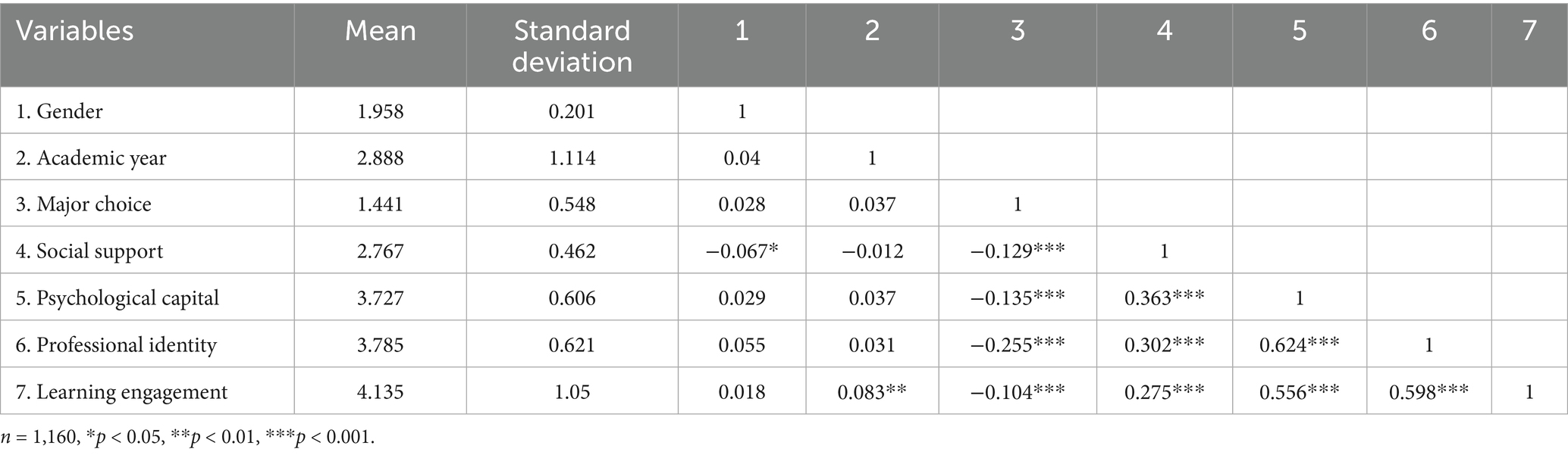To elucidate the underlying relationships among the variables, descriptive statistics and correlation analyses were performed on the key variables related to preschool teacher trainees, with the results summarized in Table 1. The results indicate a statistically significant negative correlation between gender and social support (r = −0.067, p < 0.05), while academic year demonstrates a positive correlation with learning engagement (t = 0.083, p < 0.01). Notably, major choice exhibits significant negative correlations with multiple variables: social support (t = −0.129, p < 0.001), psychological capital (t = −0.135, p < 0.001), professional identity (t = −0.255, p < 0.001), and learning engagement (t = −0.104, p < 0.001). It is therefore apparent that that gender, academic year, and major choice among preschool teacher trainees demonstrate a moderate level of correlation with the key research variables, thereby necessitating their inclusion as control variables in subsequent data analyses.