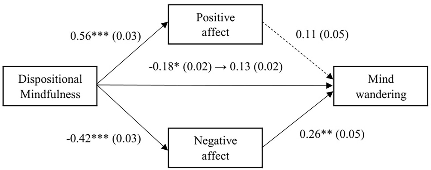 The results of the multiple mediation analysis with dispositional mindfulness as the explanatory variable are shown in Figure 2. The overall association between dispositional mindfulness and mind wandering was significant, indicating that higher dispositional mindfulness was associated with lower levels of mind wandering (β = −0.18, SE = 0.02, p = 0.03). However, when the mediating variable was controlled for, the direct effect became non-significant (β = −0.13, SE = 0.02, p = 0.16). Dispositional mindfulness was positively associated with positive affect (β = 0.56, SE = 0.03, p < 0.001), and negatively associated with negative affect (β = −0.42, SE = 0.03, p < 0.001). When one of the mediating variables was controlled for, negative affect was positively associated with mind wandering (β = 0.26, SE = 0.05, p < 0.001), but the effect of positive affect on mind wandering was not significant (β = 0.11, SE = 0.05, p = 0.27). The results of examining the indirect effects using the bootstrap method showed that the overall indirect effect was not significant (β = −0.05, SE = 0.02, 95% CI [−0.04, 0.02]). Next, the results of examining the indirect effects of each mediating variable showed that the indirect effect of positive affect was not significant (β = 0.06, SE = 0.01, 95% CI [−0.01, 0.04]), the indirect effect of negative affect was significant (β = −0.11, SE = 0.01, 95% CI [−0.05, −0.01]), indicating that dispositional mindfulness was indirectly associated with lower mind wandering through lower negative affect.