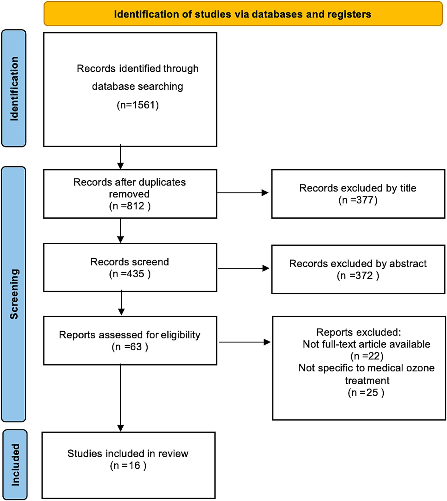 The search across all databases initially identified 1,561 records. Following the removal of 749 duplicates, 812 unique records were screened based on their titles and abstracts. After this initial screening, the full text of the remaining articles was assessed for eligibility according to the pre-defined criteria. This process resulted in the inclusion of 16 studies. Figure 1 presents the PRISMA flow diagram, illustrating the complete study selection process and the reasons for exclusion at each stage.