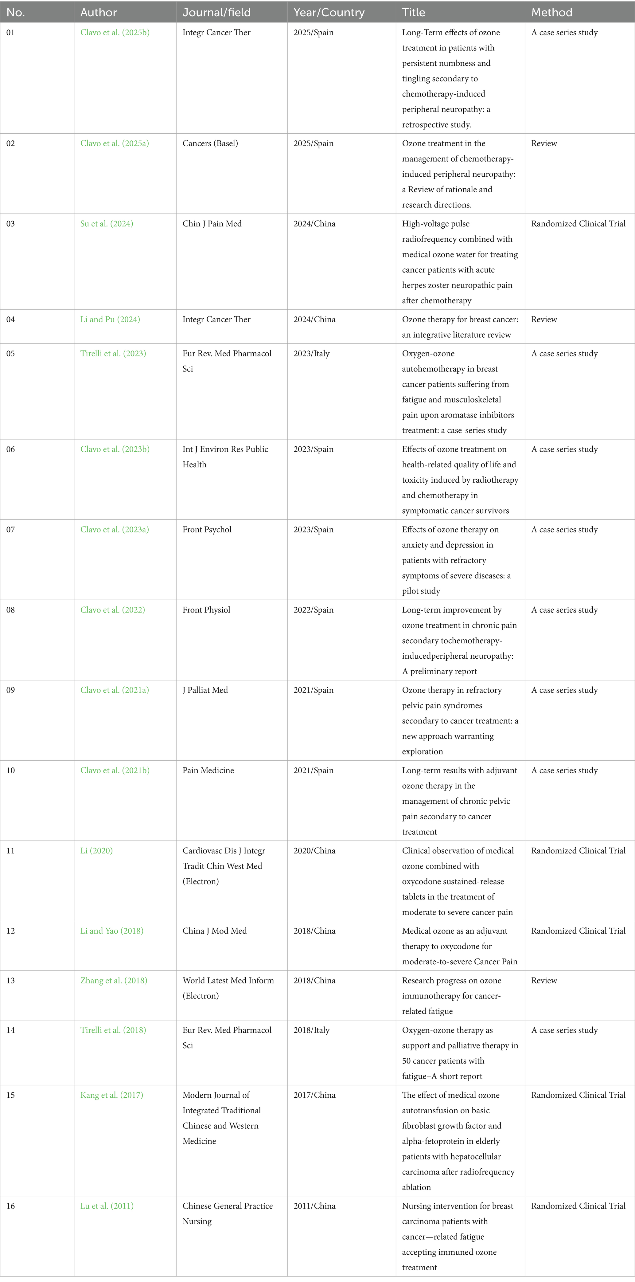 The characteristics of the 16 included studies are summarized in Table 2. Regarding chronological distribution, the majority of studies were published in 2018 (n = 3) (Li and Yao, 2018; Zhang et al., 2018; Tirelli et al., 2018) and 2023 (n = 3; Tirelli et al., 2023; Clavo et al., 2023b; Clavo et al., 2023a). Other studies were published in 2011 (Lu et al., 2011), 2017 (Kang et al., 2017), 2020 (n = 2; Clavo et al., 2021b; Li, 2020), 2021 (Clavo et al., 2021a), 2022 (Clavo et al., 2022), 2024 (Su et al., 2024; Li and Pu, 2024; n = 2), and 2025 (n = 2; Clavo et al., 2025b; Clavo et al., 2025a). Geographically, nearly half of the studies (n = 7, 43.8%) originated from China, while seven (43.8%) were from Spain, and two (12.5%) were from Italy. In terms of methodological design, the majority were case series (n = 8, 50.0%), followed by randomized clinical trials (n = 6, 37.5%), and reviews (n = 2, 12.5%). It is noteworthy that seven of the included studies were authored by or co-authored by Bernardino Clavo from Spain.